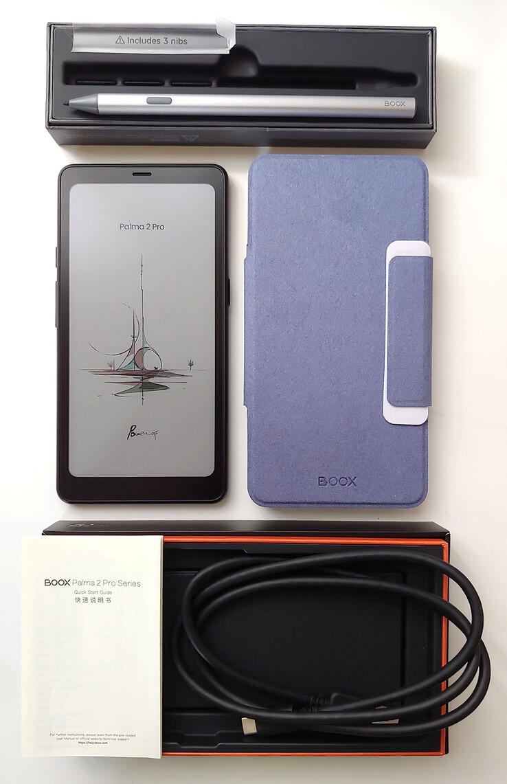 O e-reader veio com um cabo USB-C, um guia de início rápido e uma ferramenta de ejeção do SIM, além de um estojo magnético opcional e uma caneta stylus com três pontas de reposição.