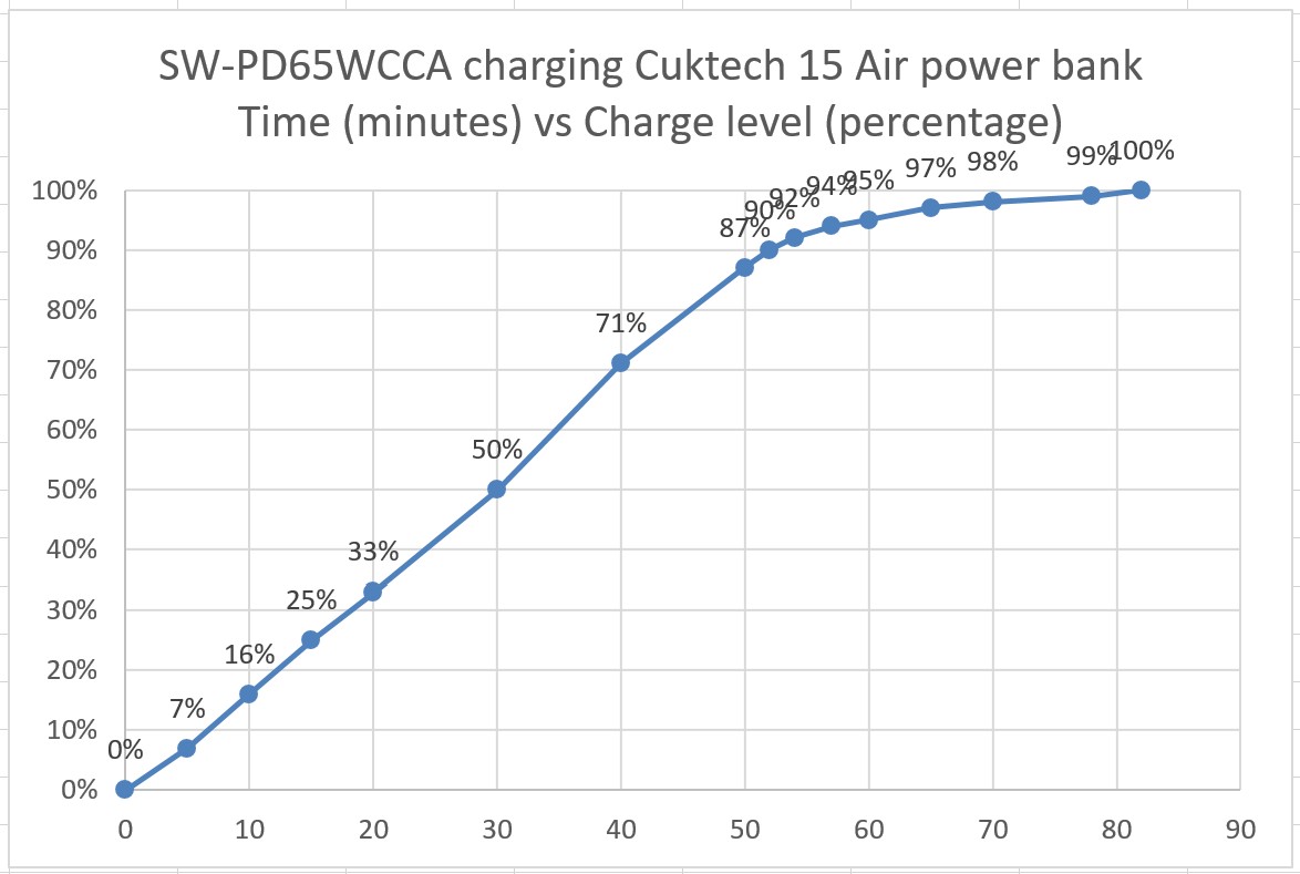 Um power bank Cuktech 15 Air (57,75 Wh) atingiu a carga total um pouco mais rápido - cerca de cinco minutos de diferença - com um Cuktech 10 Ultra (saída USB-C máxima de 100 watts) em comparação com um SW-PD65WCCA (saída USB-C máxima de 65 watts) ao usar o cabo USB-C de 6A incluído. A velocidade de carregamento não foi linear porque a maioria das baterias de íons de lítio carrega em uma taxa mais rápida de 0% a 80% e, em seguida, mais lenta até 100% por segurança.
