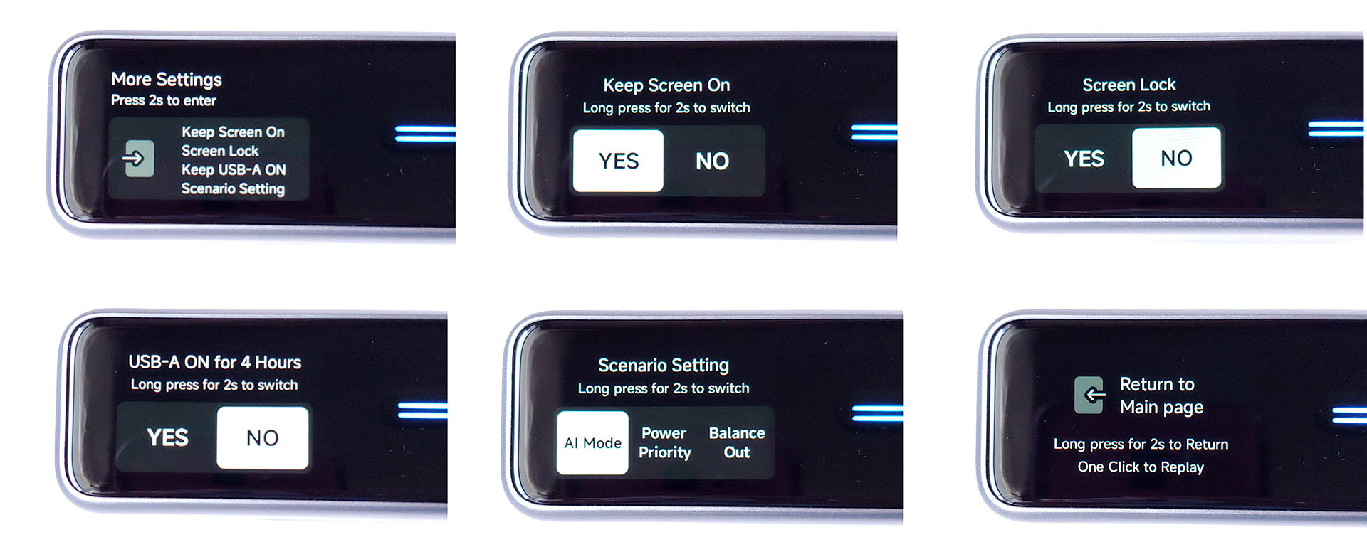 Ao visualizar as configurações, um toque de dois segundos alterna o estado de cada configuração. A principal configuração a ser observada é o modo de fornecimento de energia - AI, Power Priority ou Balanced.