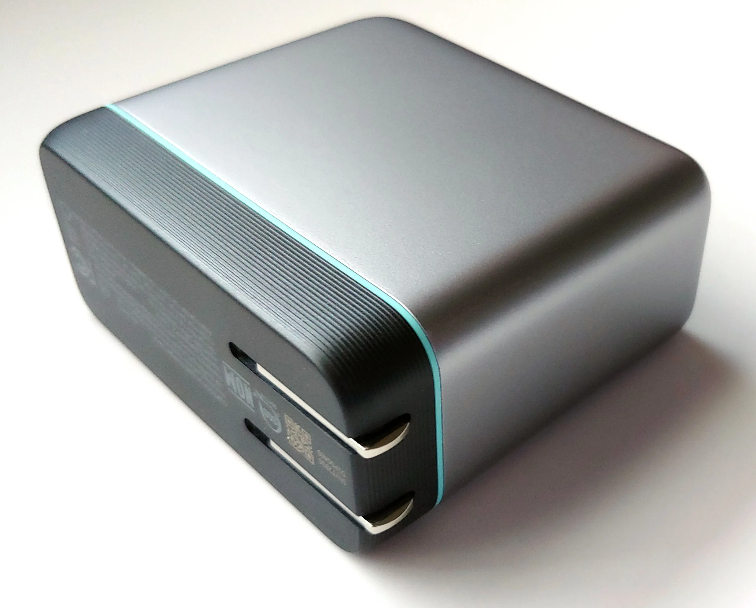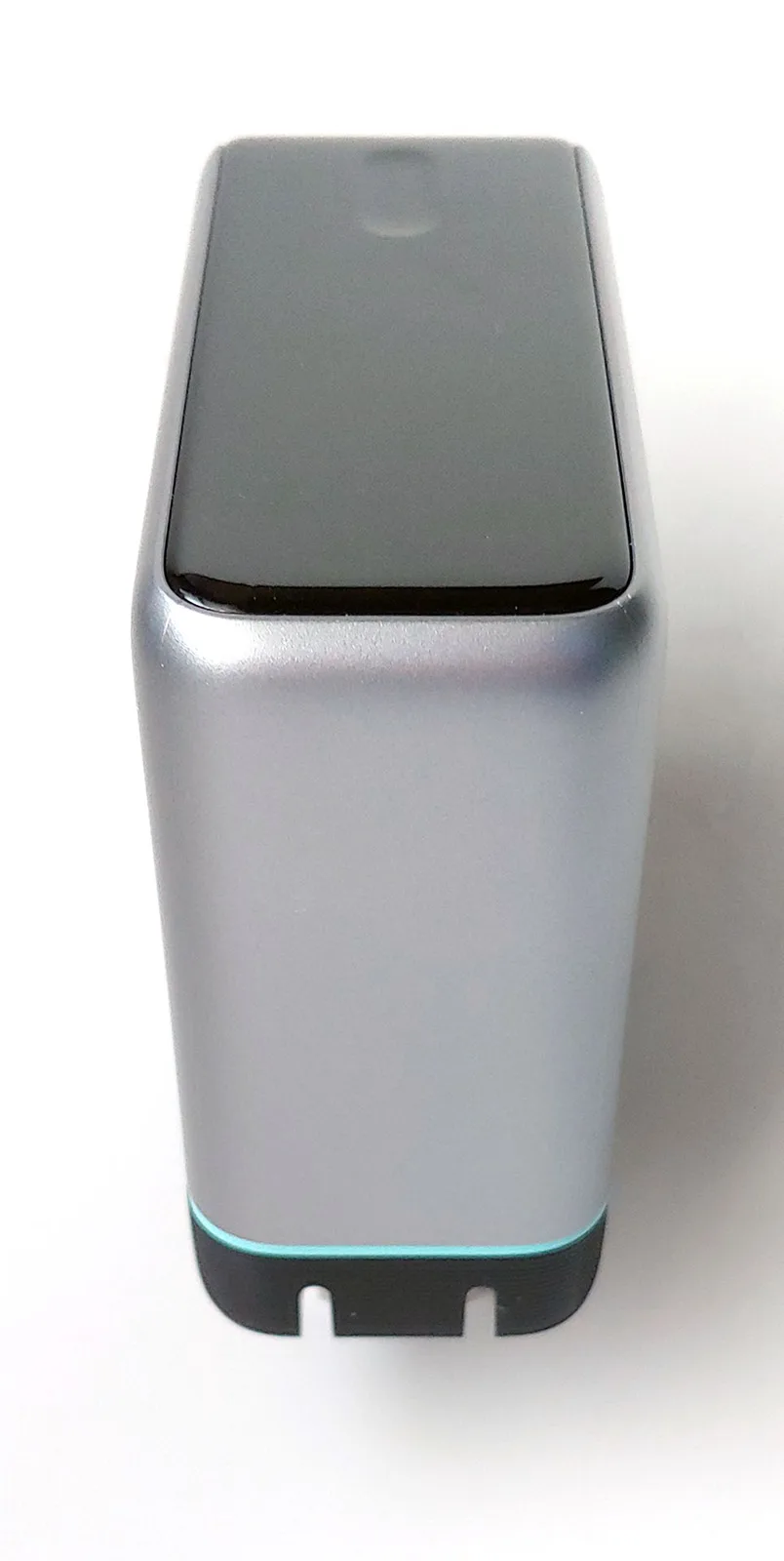 O carregador CA tem um design simples com bordas curvas e laterais planas. Quatro portas USB estão alinhadas na borda frontal - uma porta USB-A e três portas USB-C - enquanto a tela colorida e o botão de toque estão localizados na parte superior. Os pinos AC rebatíveis estão localizados na parte inferior. No geral, ele tem um design elegante que é fácil de segurar e usar com uma só mão.