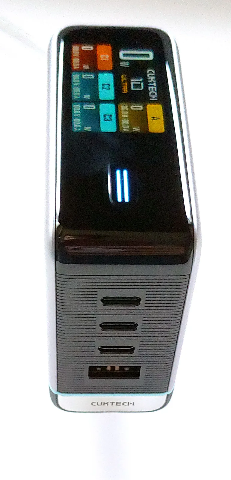 O Cuktech 10 Ultra carrega rapidamente até quatro dispositivos USB com uma saída máxima de porta única de 100 W e saída combinada de 110 W. Seu visor colorido mostra a potência, a tensão e a amperagem por porta em tempo real para ajudar a monitorar o progresso da carga. Um botão de toque acessa vários modos e configurações do visor.