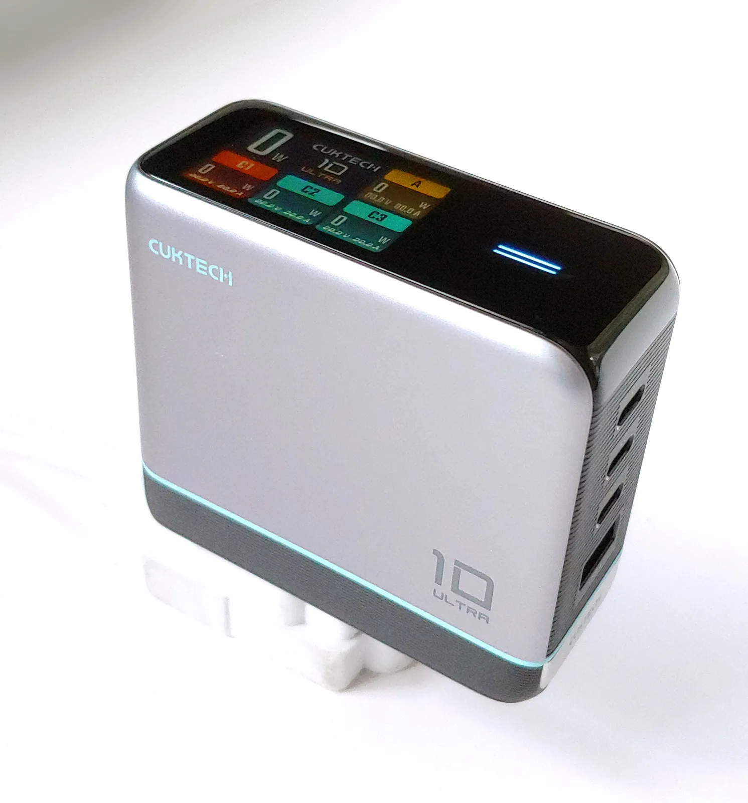 O Cuktech 10 Ultra substitui de forma conveniente vários carregadores USB e carrega rapidamente até quatro dispositivos com até 100 watts de saída combinada, fornecendo informações de fornecimento de energia por porta.