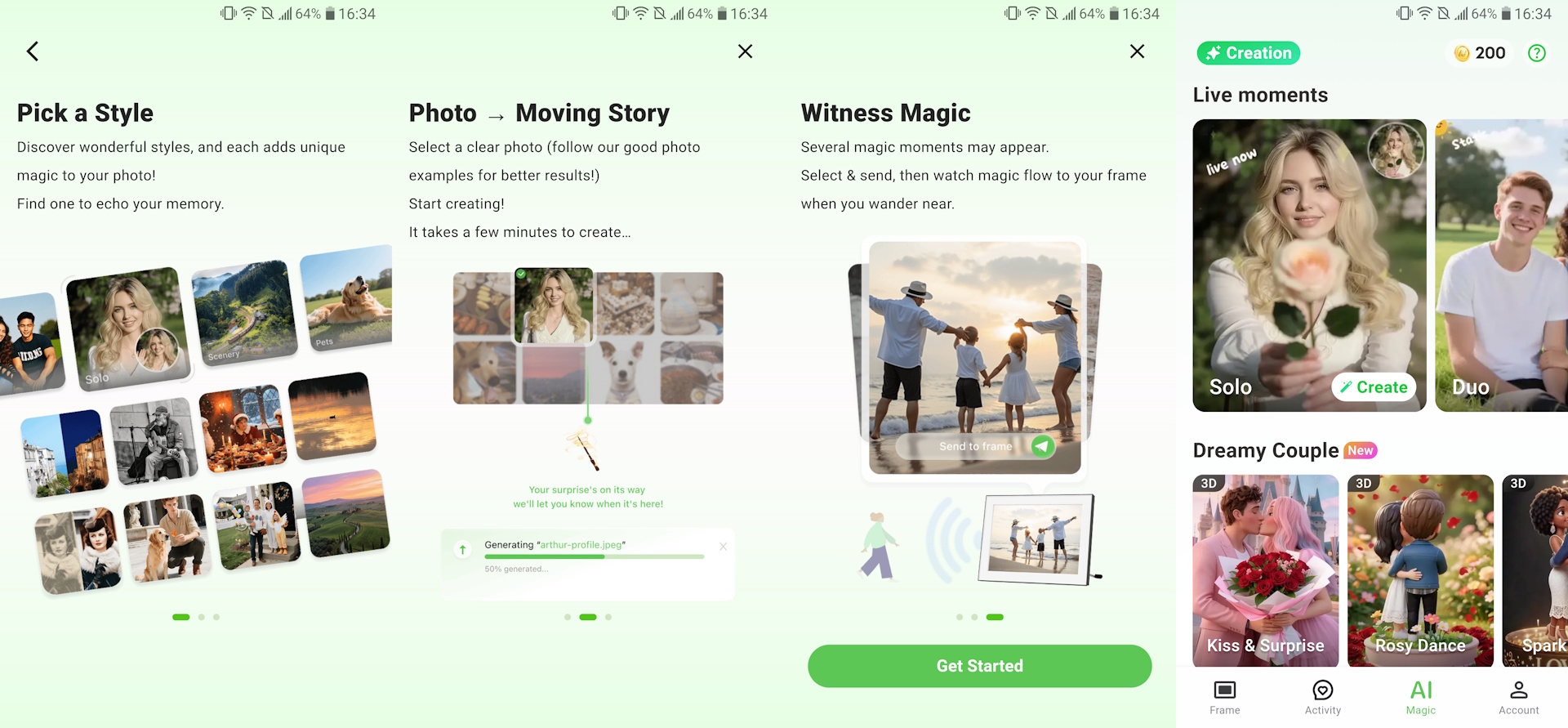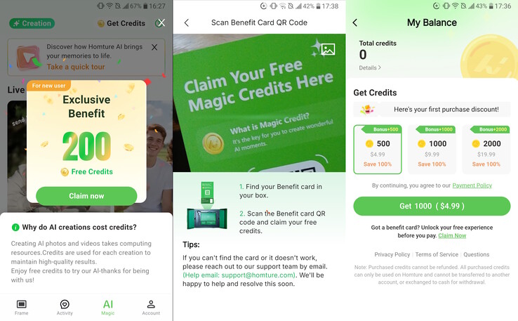Animar uma foto usando IA custa 100 moedas. A moldura vem com 2.000 moedas gratuitas em um cartão Magic Credits gratuito, e cada novo usuário do aplicativo recebe 200 moedas. Créditos adicionais começam em US$ 4,99 por 500 moedas.