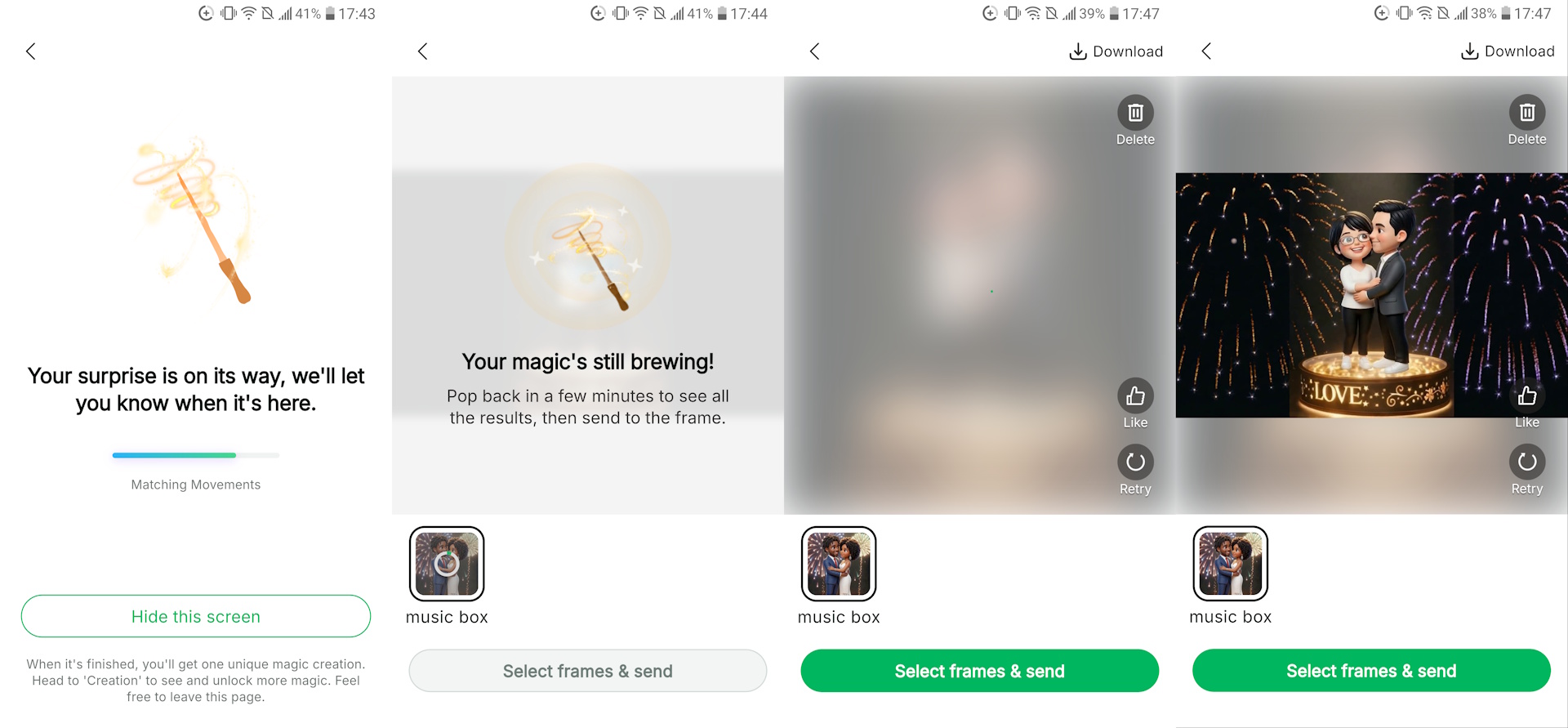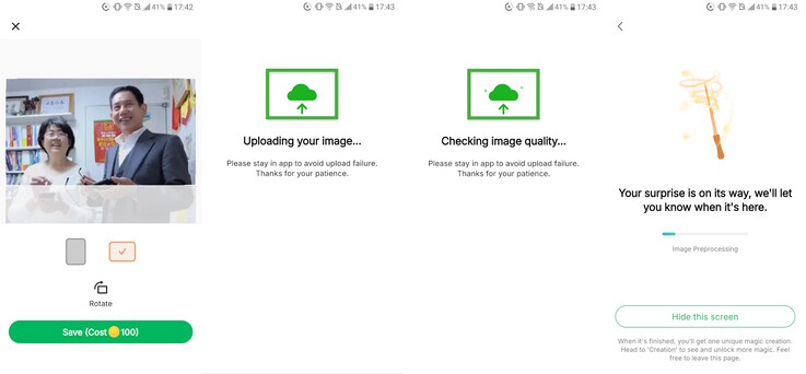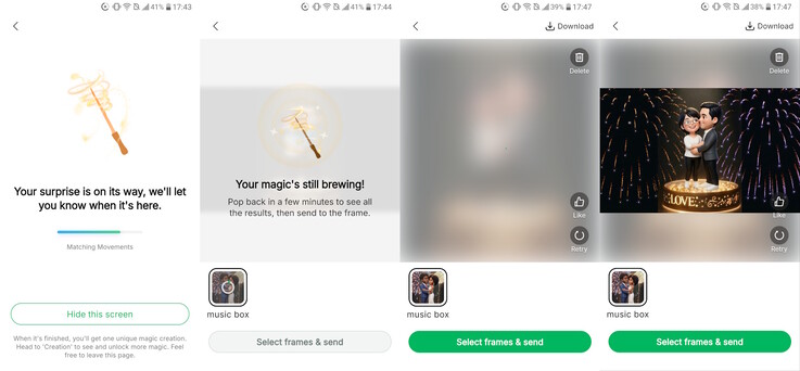 Depois que uma animação e uma foto são selecionadas no aplicativo, a IA analisa automaticamente a foto quanto à adequação, incluindo idade, qualidade da imagem e enquadramento adequado do tema. O processamento da IA pode levar vários minutos, e a animação finalizada pode ser carregada no porta-retratos ou baixada para o smartphone.