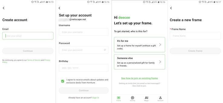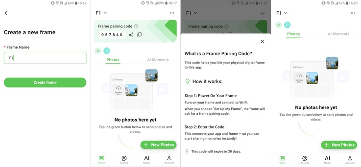 O software é muito fácil de instalar e, depois de criar uma conta, adicionar o porta-retratos requer apenas a inserção de um código de emparelhamento de seis dígitos.