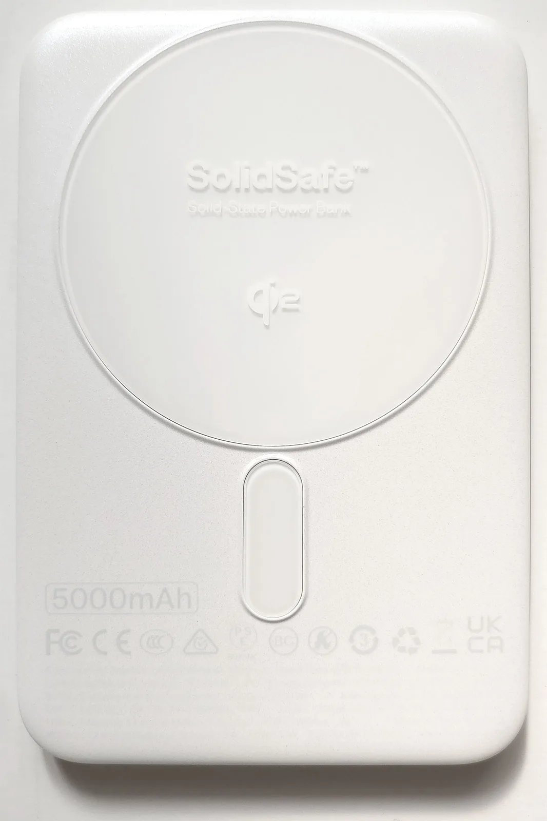 A base de carregamento magnético Qi2 está localizada na parte inferior de plástico, que tem uma cor branca perolada. A almofada circular sobressai aproximadamente 0,5 mm (0,02 pol.), de modo que o banco de potência balança levemente quando é colocado em uma superfície plana com a tampa de metal voltada para cima e a área ao redor do logotipo pressionada para baixo.