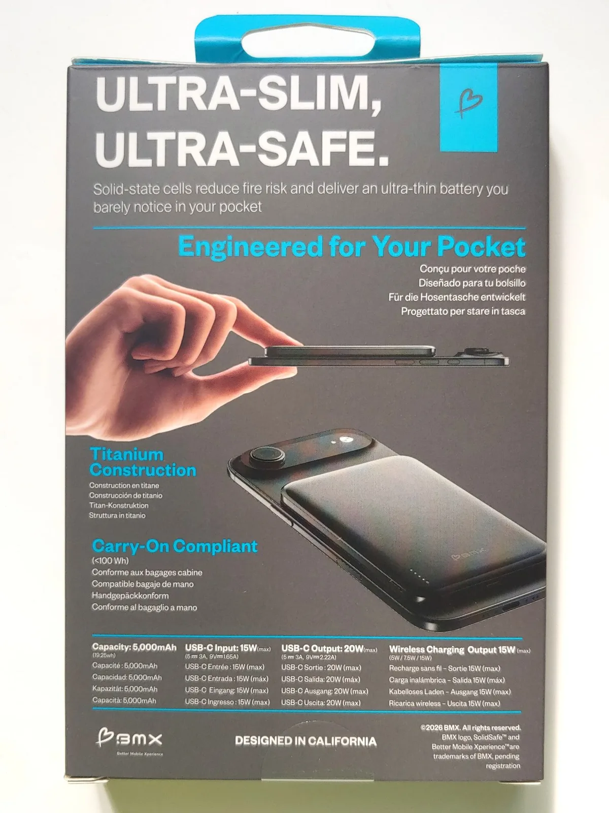 O banco de potência BMX SolidSafe Air Titanium 5K destina-se a usuários que precisam de tempo de execução adicional em um design fino que suporta carregamento magnético sem fio Qi2.