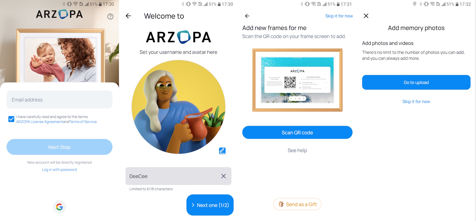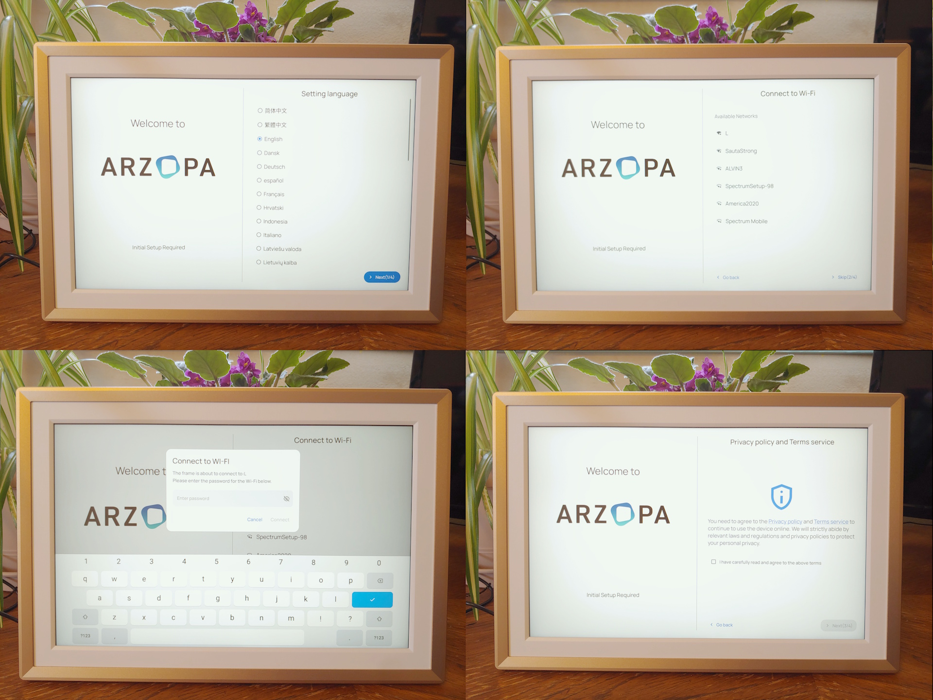 A configuração inicial do hardware consiste em várias telas, incluindo seleção de idioma, configuração opcional de Wi-Fi, concordância com os termos de serviço e políticas de privacidade e configurações de hora/data. Os usuários podem compartilhar o código QR na tela, na última tela, com amigos e familiares para acessar o porta-retratos ou adicionar um código de presente para ver as fotos presenteadas, como as de um casamento. Foi necessária uma atualização de firmware na unidade analisada, que levou vários minutos para ser instalada.