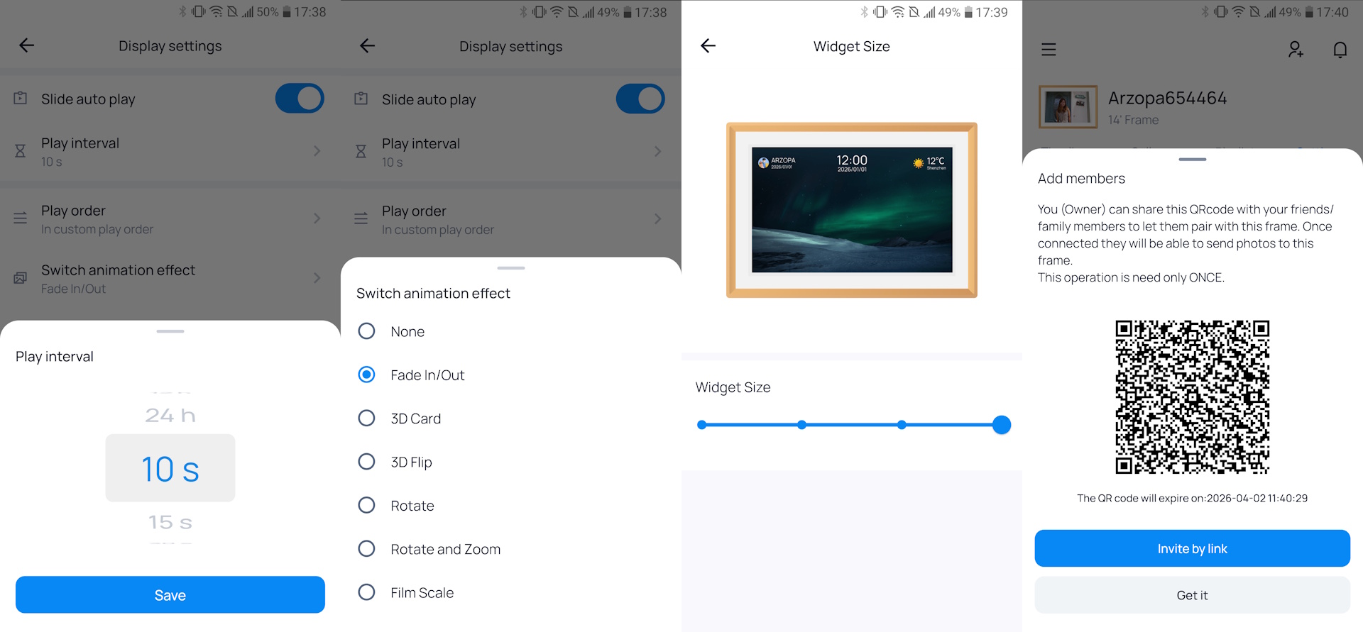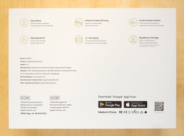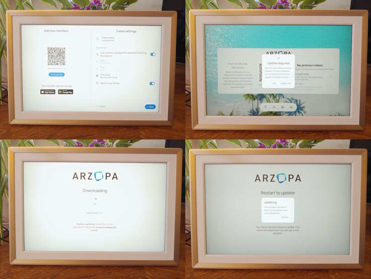 O software é fácil de instalar, e adicionar uma foto leva apenas alguns segundos. O acesso à moldura Arzopa pode ser compartilhado com amigos e familiares, permitindo que todos façam upload de fotos remotamente por meio do aplicativo. O aplicativo também permite que os compradores carreguem previamente uma bênção e uma foto antes de presentear, e os proprietários podem adicionar códigos de presente para importar fotos adicionais do evento.