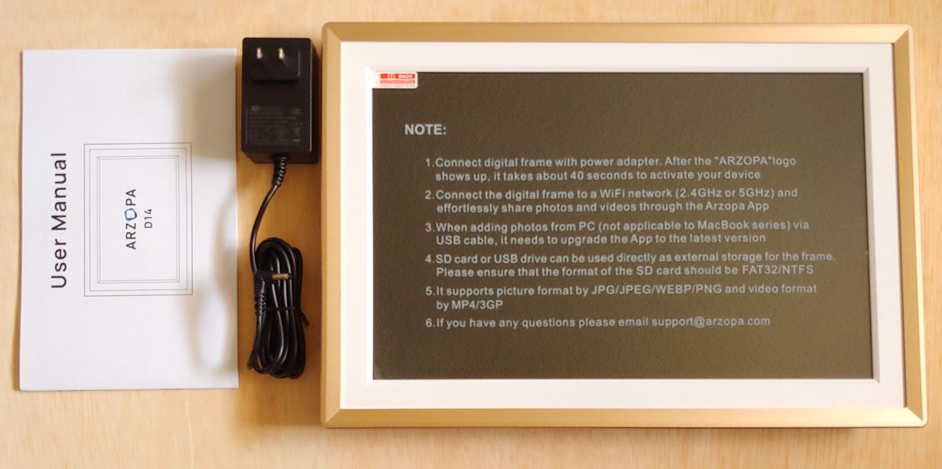 O Arzopa foi embalado com um adaptador CA e um manual do usuário.