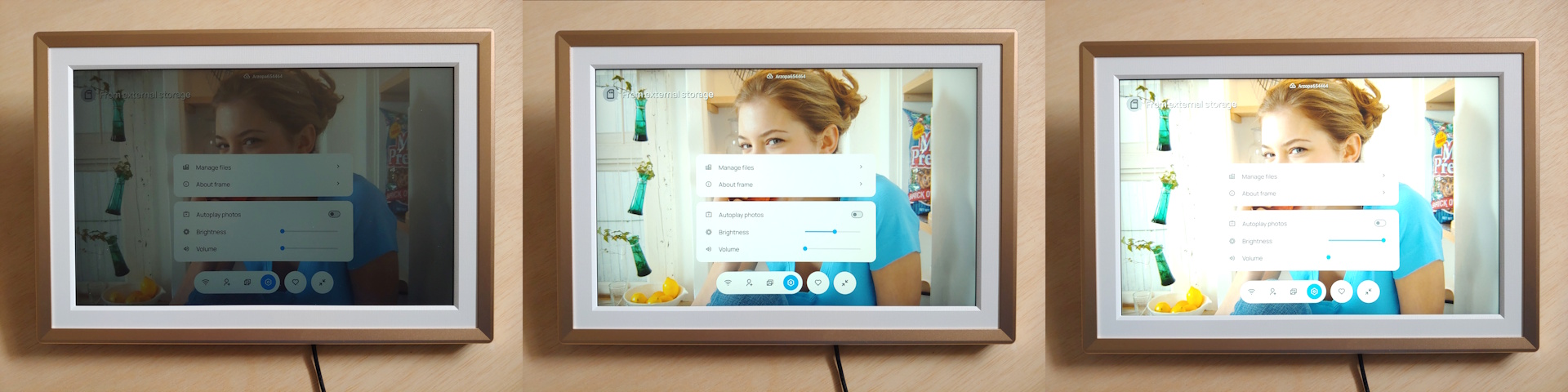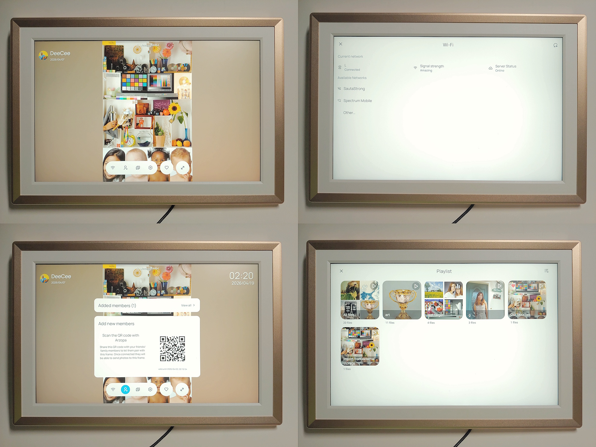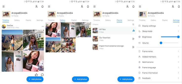 As configurações de Wi-Fi facilitam a adição de uma nova conexão, embora não haja suporte para redes proxy. As configurações de usuário permitem a adição rápida de novos membros que podem carregar fotos remotamente. O menu Fotos permite que os usuários reproduzam mídia de um cartão SD, transfiram arquivos por USB, excluam itens ou redefinam o quadro, com pastas disponíveis para organizar grandes bibliotecas. As configurações do sistema controlam o brilho, o volume, a reprodução automática de fotos e o gerenciamento de arquivos.