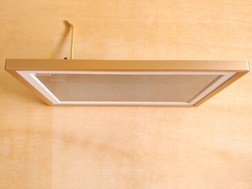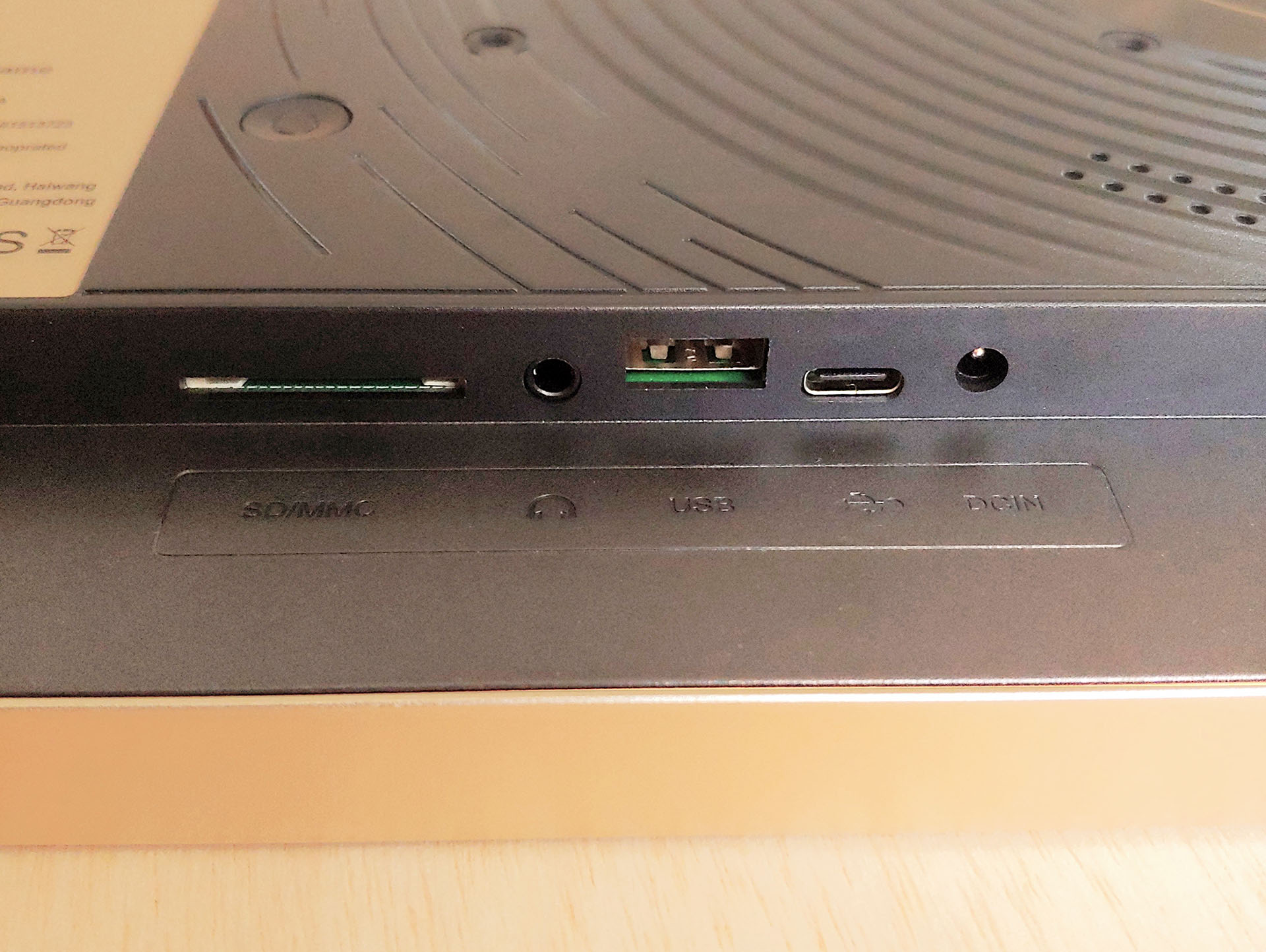 Todas as portas, inclusive a de alimentação, USB-A, USB-C, o slot para cartão SD e a entrada para fone de ouvido de 3,5 mm, estão na parte traseira. Não há botão liga/desliga, portanto, ao conectá-lo, ele é ligado, e o desligamento ou a suspensão são feitos por meio do menu.