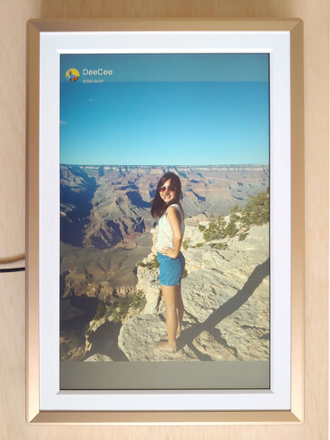 O porta-retratos inclui 32 GB de armazenamento interno e armazenamento ilimitado na nuvem. Os usuários podem adicionar legendas opcionais e cortar fotos na orientação paisagem ou retrato, embora as edições avançadas exijam aplicativos externos. Também há suporte para clipes de vídeo curtos.