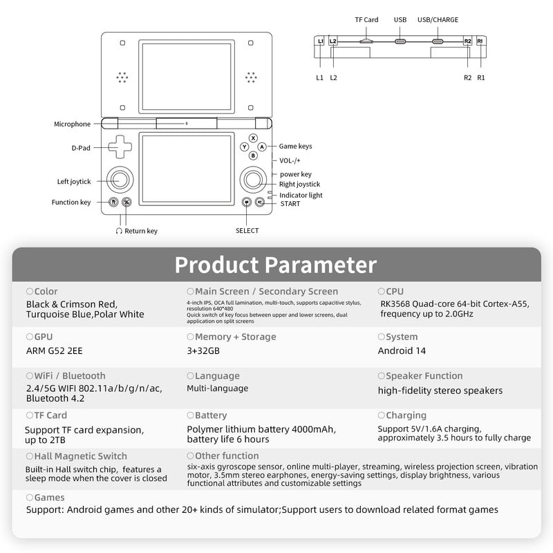 A Anbernic complementa esse modesto SoC com 3 GB de RAM, provavelmente LPDDR4 ou LPDDR4X, 32 GB de armazenamento expansível e uma bateria de 4.000 mAh com capacidade para até 6 horas de jogo entre cargas. Além disso, o dispositivo portátil para jogos suporta conectividade Bluetooth 4.2 e Wi-Fi 5 com Android 14 pré-instalado.