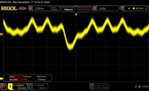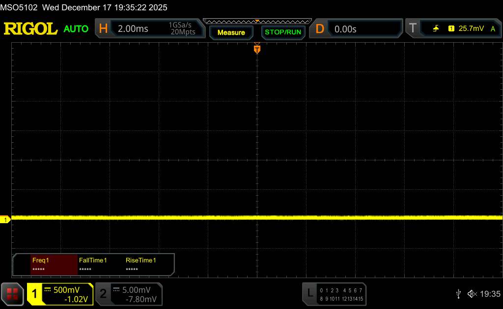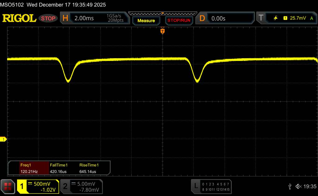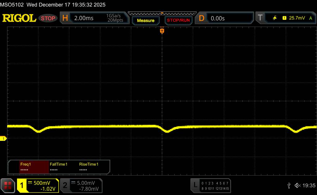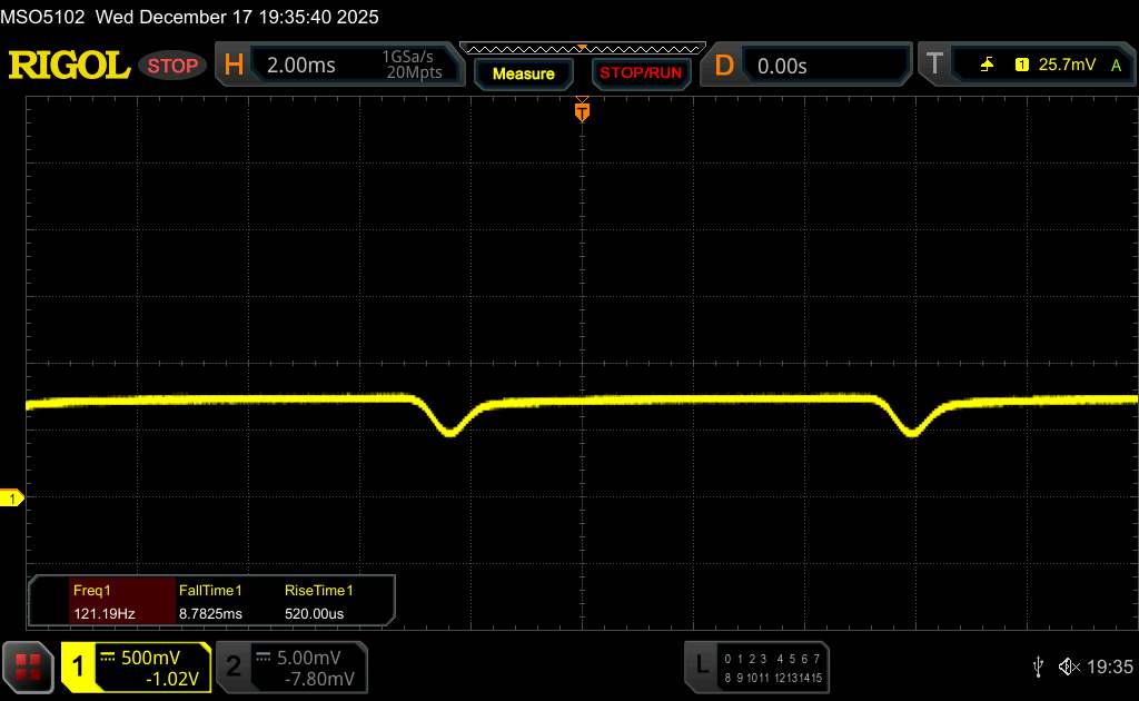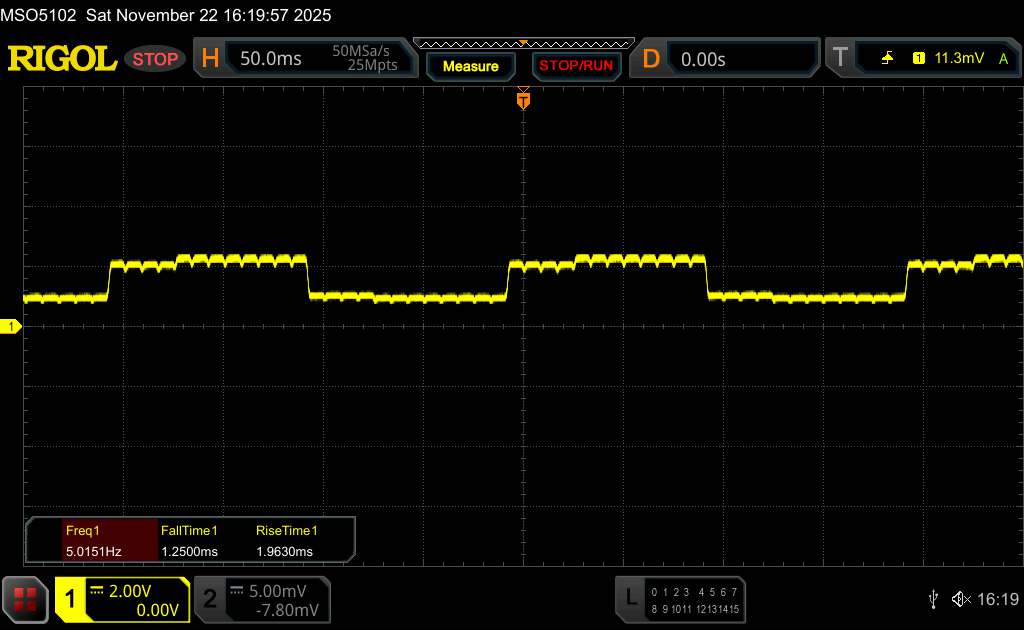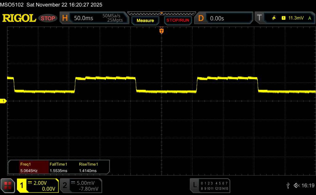 Como esse é um painel OLED, o brilho é controlado por modulação de largura de pulso. De acordo com o fabricante, o iQOO 15 usa escurecimento PWM de alta frequência a 2.160 Hz para reduzir possíveis efeitos negativos, como cintilação visível. Nossas medições usando o software Rigol indicam uma frequência básica de cerca de 560 Hz.
