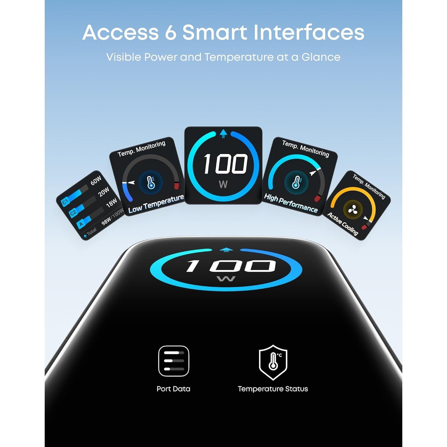 Ao carregar um único dispositivo, qualquer uma das portas USB-C pode fornecer a saída total de 100W. A potência é dividida em 70 W e 30 W, 67 W e 33 W ou 95 W e 5 W quando dois dispositivos estão conectados, e em 80 W, 12 W e 7,5 W quando todas as três portas estão em uso. De qualquer forma, os usuários obtêm energia suficiente para carregar um laptop e outros dispositivos ao mesmo tempo. Além disso, o carregador inclui um modo automático de baixo consumo de energia que limita a saída USB-A a 5 W para dispositivos de baixo consumo de energia, como fones de ouvido.