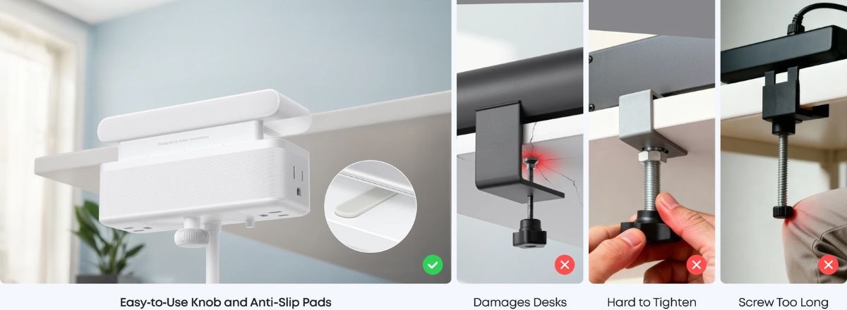 O Nano Power Strip da Anker tem um design de grampo ajustável, com as duas metades presas acima e abaixo de sua mesa usando um botão integrado. De acordo com a empresa, esse sistema mantém o dispositivo firmemente no lugar, permitindo que os usuários conectem ou desconectem dispositivos com uma mão sem que ele se mova. Ele foi projetado para caber em mesas com espessura de 0,6 a 1,8 polegadas (~12 a 45 mm), e esse carregador GaN mede 6,02 x 2,06 x 3,97 polegadas (153 x 52,2 x 100,85 mm).