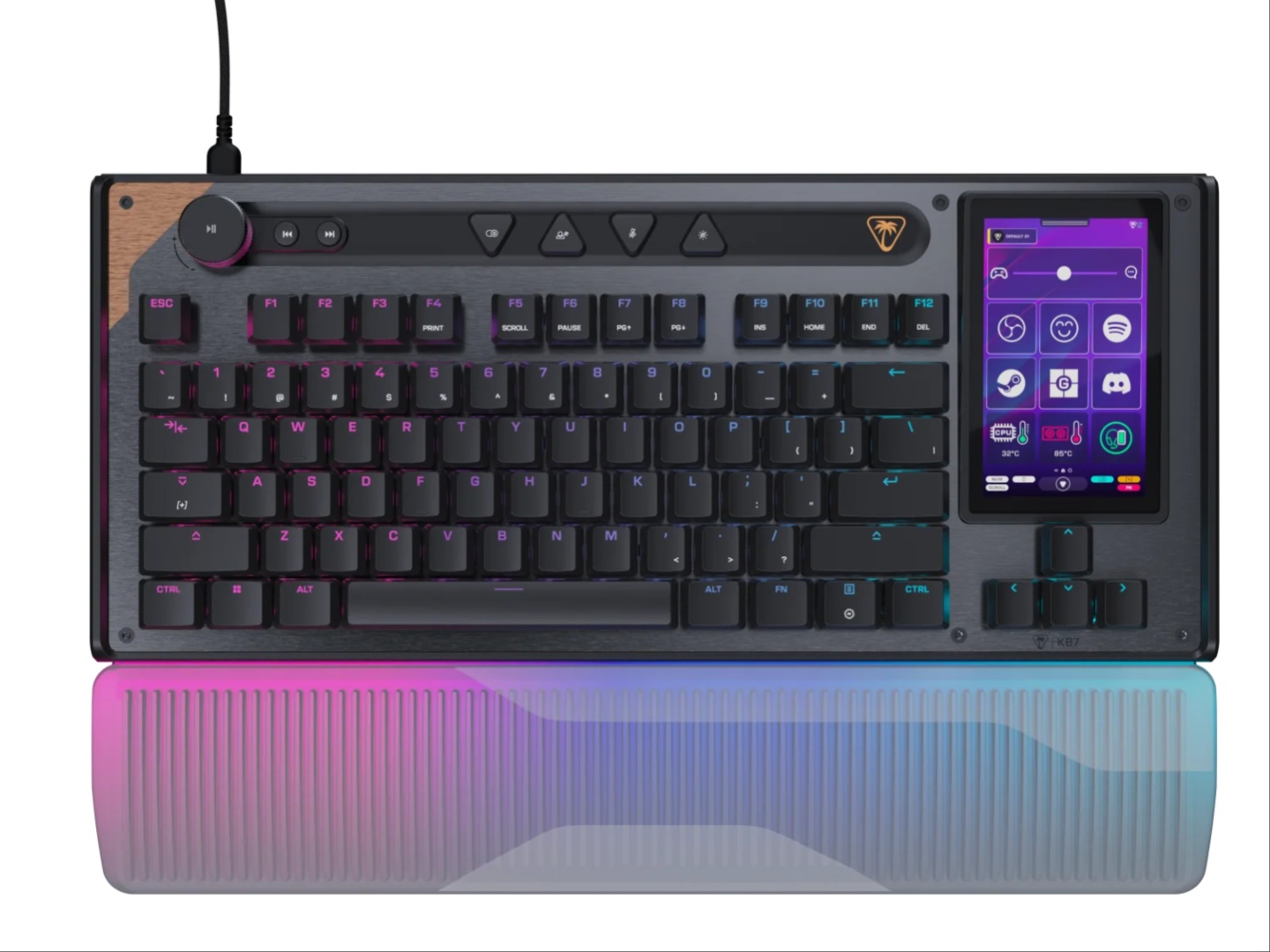 Começando pelo Command KB7 TKL, ele é um teclado com fio com interruptores de efeito Hall com atuação ajustável e Rapid Trigger. A parte mais interessante é uma tela sensível ao toque de 4,3 polegadas chamada Command Touch Display, que possui controles OBS integrados e funções Streamlabs, o que torna o streaming mais simples. Mas ela oferece muito mais recursos, de modo que os usuários que não fazem streaming também podem usá-la plenamente. Ele permite acionar macros, alternar perfis, ajustar o áudio, iniciar aplicativos e monitorar as estatísticas do sistema.