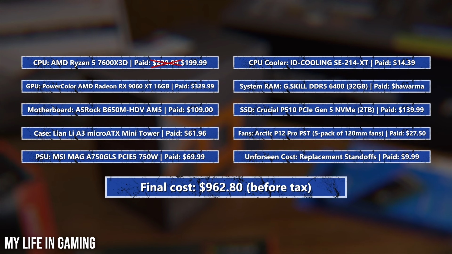 A DF mostrou uma montagem de PC equivalente ao PS5 Pro do canal do YouTube My Life In Gaming. A montagem custou US$ 963 com uma RX 9060 XT de 16 GB, um Ryzen 5 7600X3D e 2 TB de armazenamento. No entanto, o PC para jogos não incluía o preço dos 32 GB de memória DDR5-6400 que ele usava.