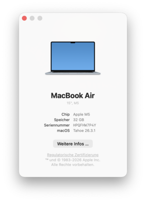 O design do gabinete, incluindo as portas, a webcam e os dispositivos de entrada, não mudou em comparação com o modelo anterior do modelo M4 anteriorportanto, o senhor ainda terá um laptop muito fino, mas não particularmente leve, com 1,512 kg. A qualidade é excelente, tanto em termos de estabilidade quanto de qualidade de construção. O Apple atualizou o módulo Wi-Fi e agora suporta o padrão Wi-Fi 7 mais recente, incluindo Bluetooth 6.0. As taxas de transferência em nosso teste foram boas e estáveis, além de melhores do que as do menor MacBook Air 13 M5. As imagens a seguir são da geração M4 anterior.