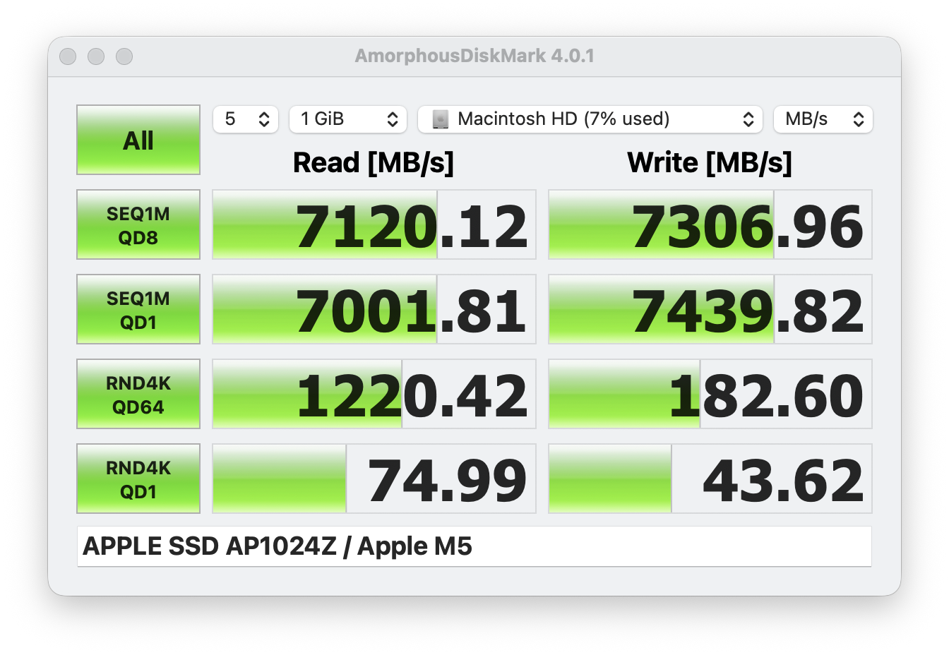 Apple mais uma vez aumentou significativamente o desempenho com seu novo SoC M5, que atualmente é de longe o processador de núcleo único mais rápido disponível no mercado. Os aprimoramentos em seu desempenho gráfico e de vários núcleos em relação ao antigo SoC M4 são agora ainda maiores. Além disso, a velocidade dos SSDs foi aumentada para os níveis de PCIe 4.0.