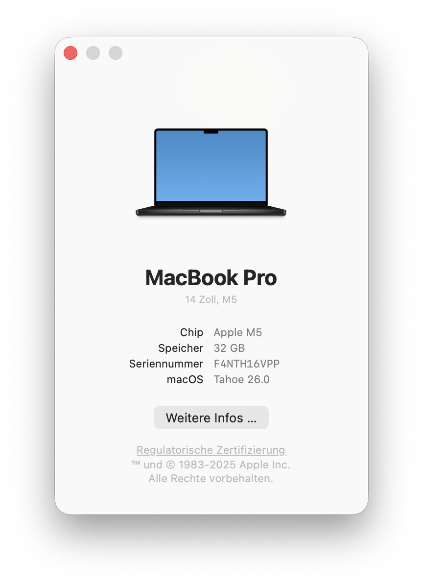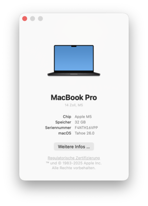 | Apple MacBook Pro 14 2025 M5 Apple M5 (10 Cores) ⎘ Apple M5 GPU ⎘ 32 GB Memória, 1024 GB SSD | Amazon: 1. $1,999.00 Apple 2025 MacBook Pro Lapto... 2. $2,189.13 Apple 2024 MacBook Pro Lapto... 3. $19.96 BlueSwan Anti-Cracking Hard ... Preço de tabela: 2739€ | 1.5 kg | 15.5 mm | 14.20" 3024x1964 254 PPI Mini-LED | |