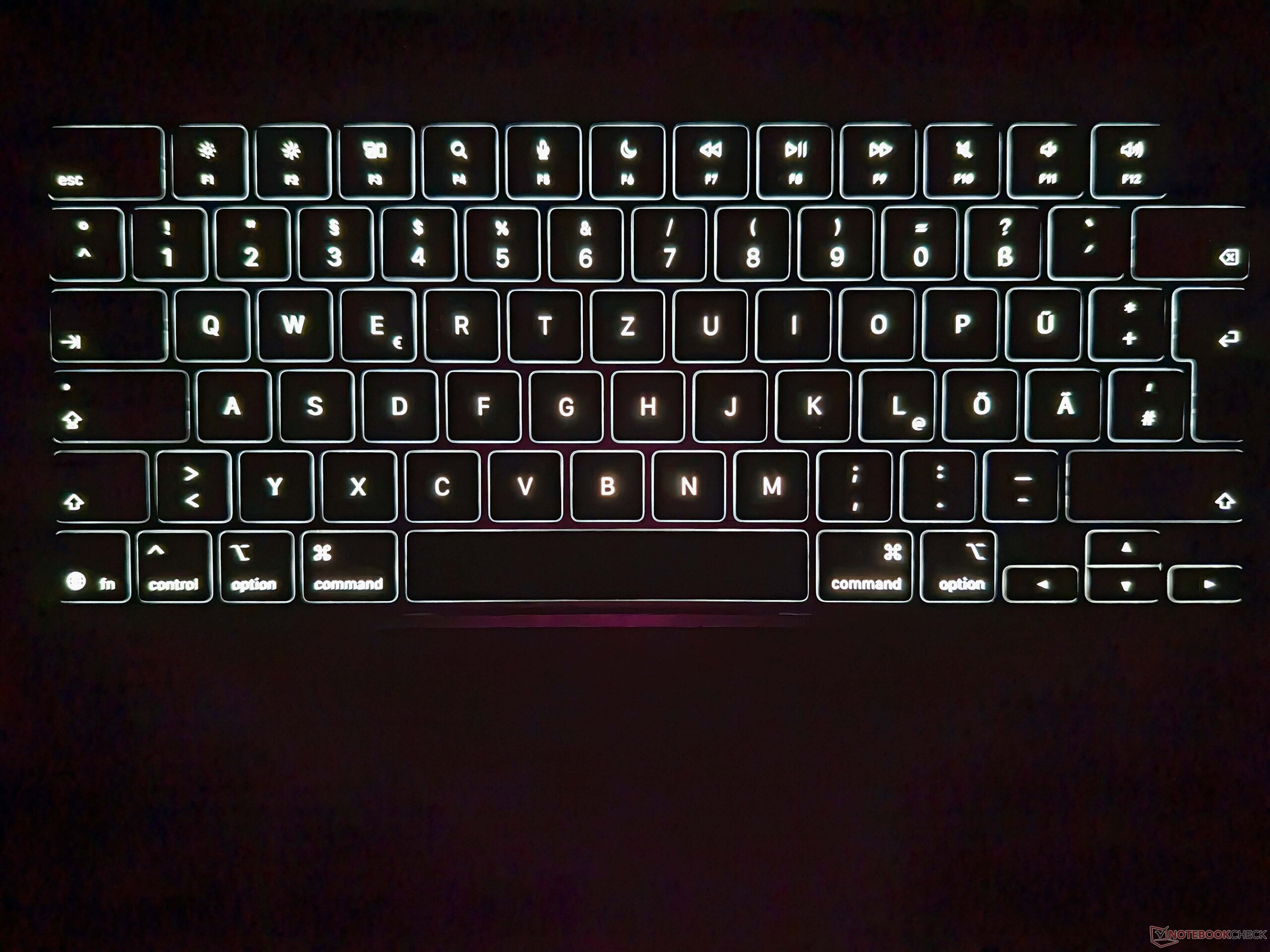 Apple continua a contar com o conhecido painel Mini LED. Os compradores também podem escolher uma versão fosca (+$150), que estava disponível durante o teste. A qualidade da imagem sofre um pouco com a superfície fosca e as cores não são tão brilhantes, mas, em contrapartida, o senhor pode trabalhar em ambientes claros sem ter que lidar com reflexos irritantes. A luz de fundo do Mini LED pisca constantemente em uma frequência muito alta de pouco menos de 15 kHz, portanto, não deve haver problemas para usuários sensíveis. Infelizmente, devido a essa oscilação, não foi possível determinar com precisão os tempos de resposta da tela, portanto, nossos resultados de medição têm significado limitado. Juntamente com sua taxa de atualização de 120 Hz, não há problemas com fantasmas visíveis.