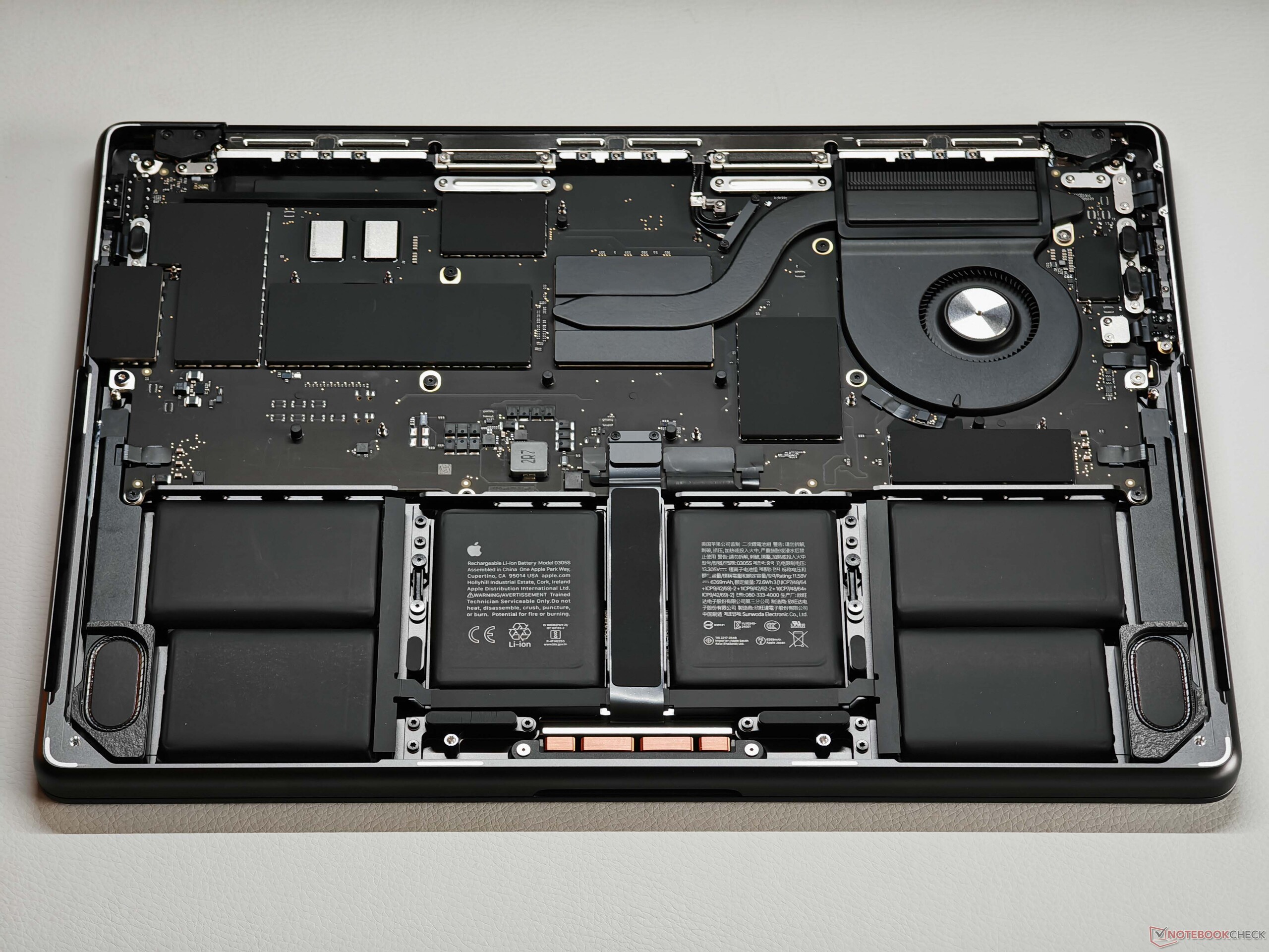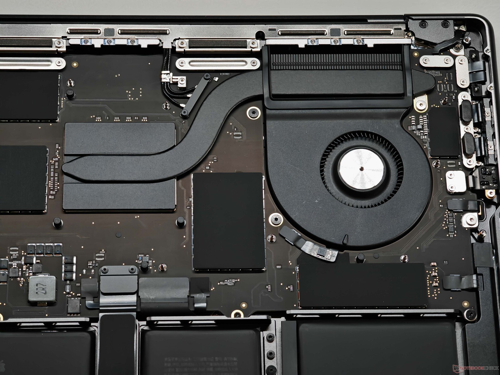 Não foram feitas alterações no gabinete, nas portas ou nos dispositivos de entrada do laptop em comparação com o modelo anterior. Sua construção unibody de alumínio ainda é excelente e super resistente. No entanto, continua a não haver praticamente nenhuma opção de manutenção. Embora a tampa inferior do gabinete possa ser removida, somente a ventoinha pode ser limpa por dentro.