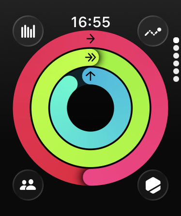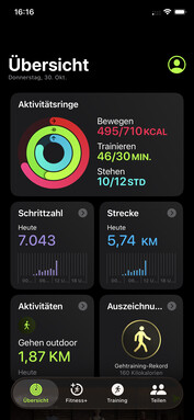 Apple continua a usar seus anéis de atividade exclusivos para monitorar o movimento diário. Os anéis representam as calorias queimadas durante o exercício, os minutos de treinamento ativo e as horas passadas em pé. O software também exibe dados adicionais, como passos dados, distância percorrida e andares subidos - tudo bem organizado em uma linha do tempo. Os usuários podem até mesmo visualizar tendências de longo prazo para cada categoria.