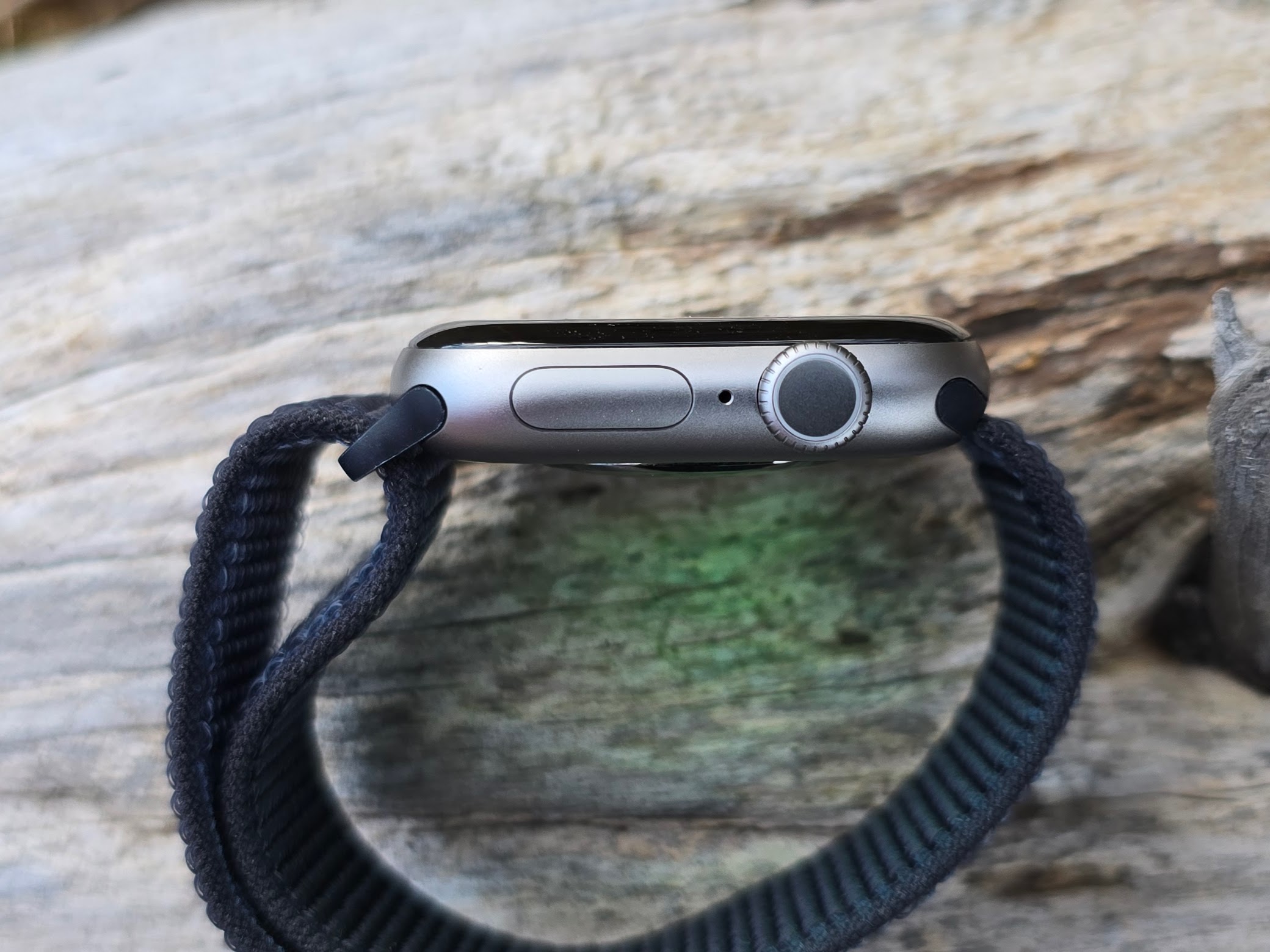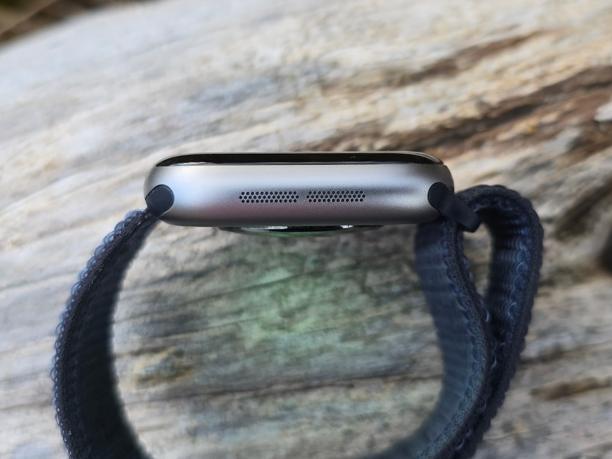 O Watch 11 tem classificação IP6X e, de acordo com o site Apple, pode ser submerso em água até 6 metros de profundidade - até mesmo na água do mar. Ele apresenta a coroa digital giratória e pressionável característica do Applepara navegar pelos menus, acompanhada por um botão lateral secundário e um microfone colocado entre eles.