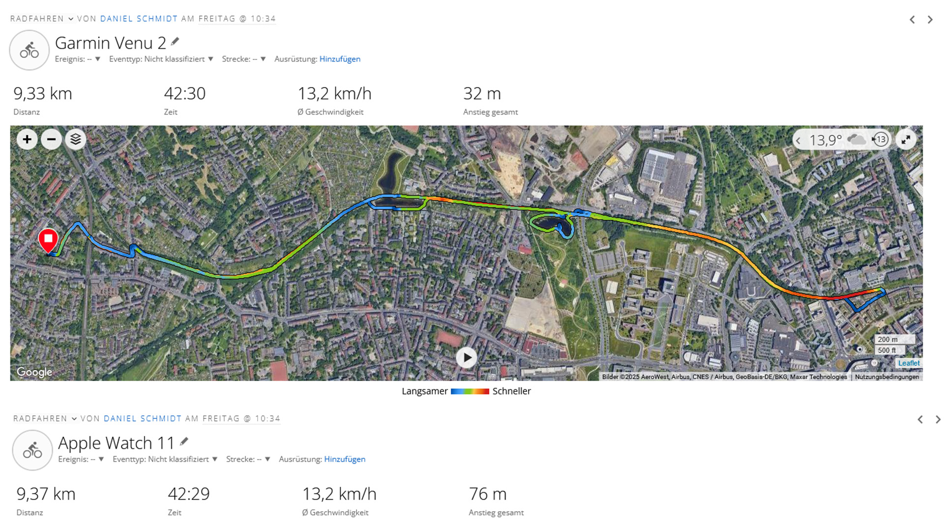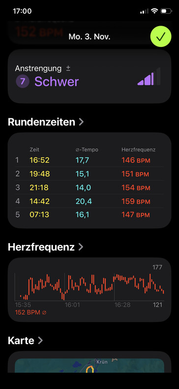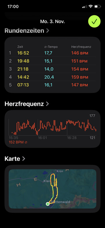 Também medimos a frequência cardíaca durante a atividade em três momentos diferentes. Em média, o desvio foi de apenas 0,4%, sendo que a maior discrepância foi de duas batidas por minuto; duas das três medições foram idênticas. (Nós compilamos uma visão geral detalhada da precisão da medição do smartwatch separadamente)