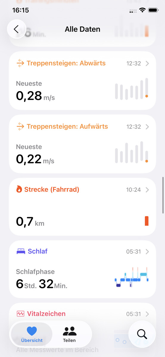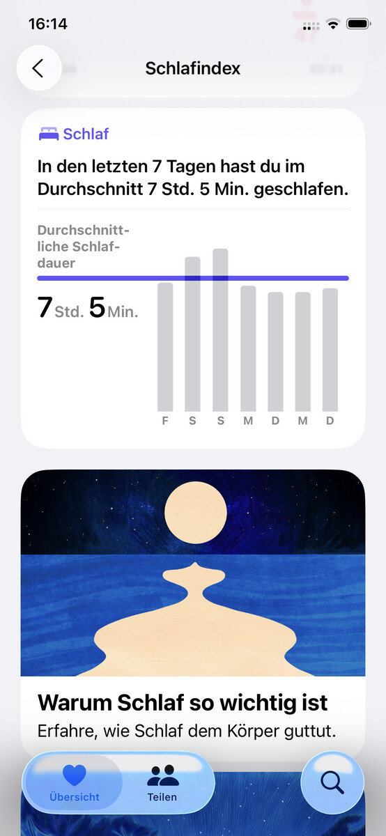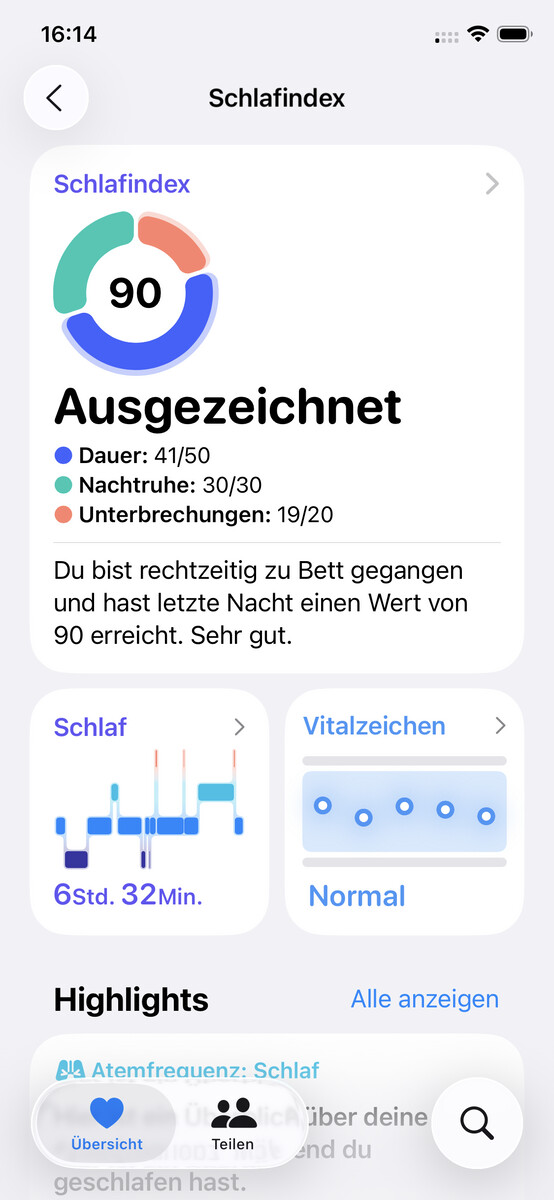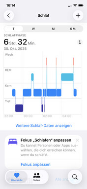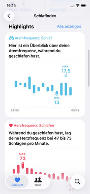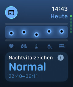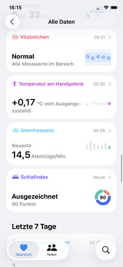 O Apple Watch Series 11 inclui um rastreamento abrangente do sono. O software divide os estágios individuais do sono e atribui uma pontuação geral do sono. Ele também registra várias métricas vitais durante a noite, inclusive a frequência respiratória e a temperatura da pele.