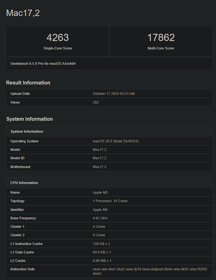 Sua pontuação é de 4.263 no teste de núcleo único do Geekbench, o que torna o Apple M5 cerca de 13% mais rápido que o Apple M4 (média de 3.748). No teste de vários núcleos, o M5 marca 17.862 pontos, um aumento de 17% em relação ao seu equivalente de última geração (15.173 pontos devido aos núcleos extras da CPU).