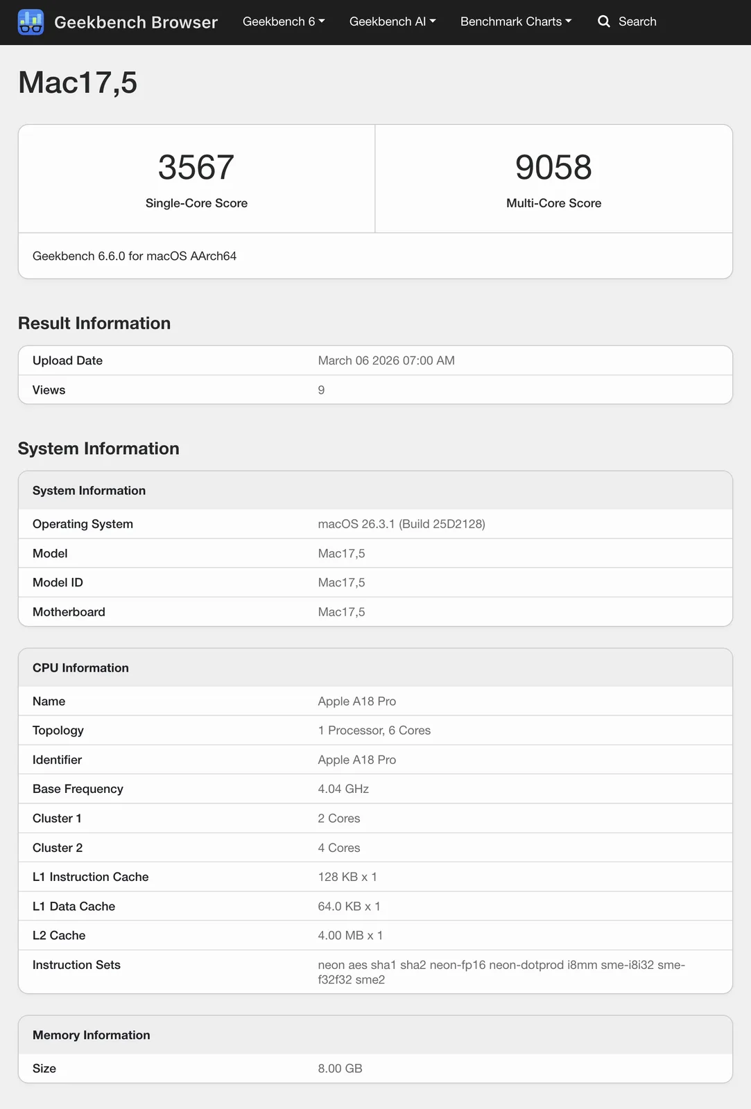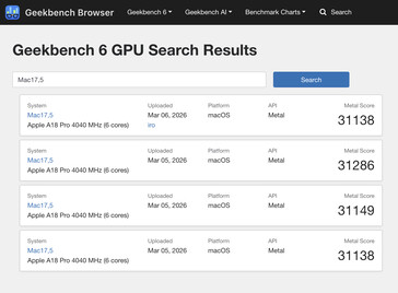 Por um lado, o desempenho da GPU parece estar um pouco à frente do MacBook Air com processador M1 que analisamos em 2020. Na época, esse dispositivo obteve uma média de 30.112 no benchmark Geekbench 6.5 Metal. Enquanto isso, o MacBook Neo retorna 31.178 dos benchmarks que foram listados até agora. Esse resultado é cerca de 5,7% inferior ao do iPhone 16 Pro Max apesar de conter 16,6% menos núcleos de GPU.