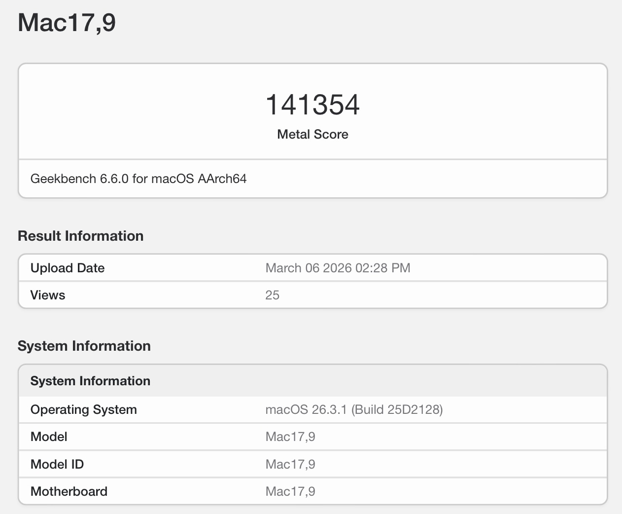 Agora, o M5 Pro apareceu no mesmo benchmark mesmo benchmark, marcando impressionantes 141.000 pontos no teste Metal. No OpenCL, que foi depreciado no macOS há mais de 6 anos, o M5 Pro conseguiu obter cerca de 87.155 pontos. Considerando que o SoC tem metade do número de núcleos de GPU que o M5 Max, os resultados estão de acordo com o que se poderia esperar.