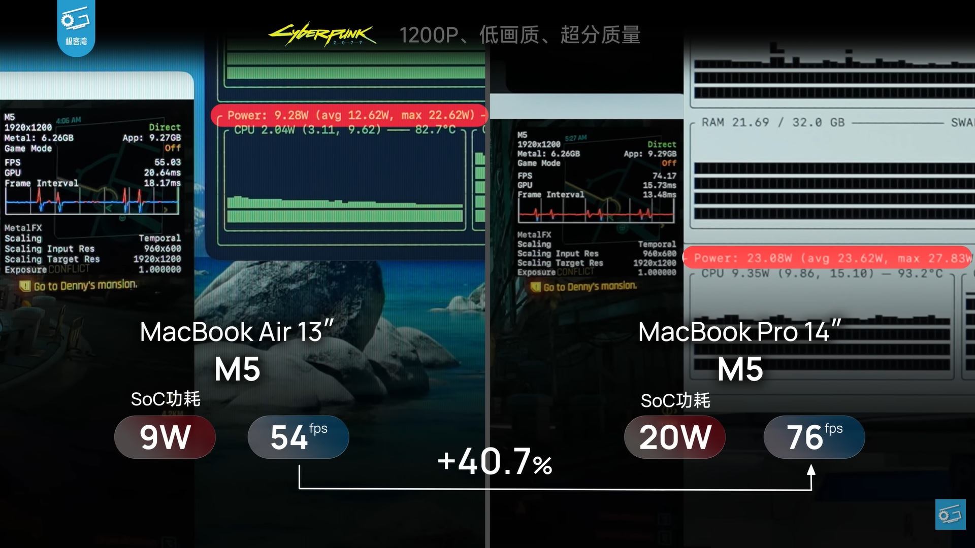 O crítico de tecnologia coreano Geekerwan relata que, no Cyberpunk 2077 a 1200p/baixo com upsampling MetalFx, o MacBook Air 13 M5 consumiu apenas 9 W e conseguiu 54 FPS. No entanto, o MacBook Pro 14 M5 executou o jogo a 76 FPS e consumiu 20 W. Essa é uma diferença de desempenho gigantesca de 40,7% entre os dois notebooks.