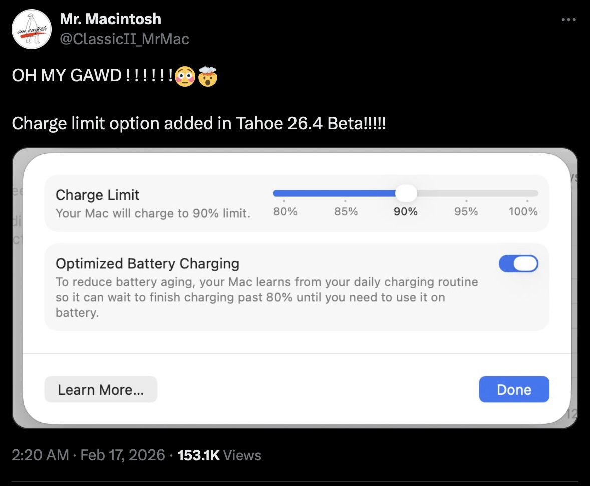 Com o mais recente macOS Tahoe 26.4 BetaApple parece ter cavado a sepultura para aplicativos como o AlDente. Pela primeira vez, os usuários do MacBook podem impor limites de carga no aplicativo System Settings, embora o valor mais baixo possível esteja bloqueado em 80%. Aqueles que quiserem números ainda mais baixos, por qualquer motivo, ainda terão que optar por soluções de terceiros.