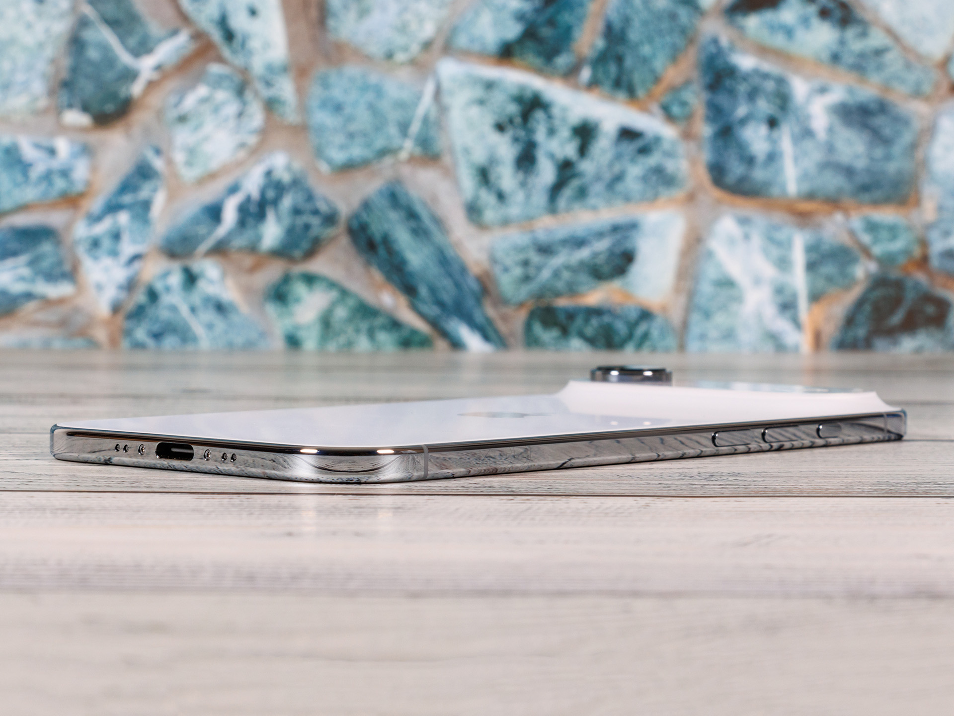 Apple a empresa usou uma liga de titânio altamente polida para a estrutura. Ela pode parecer elegante, mas também é propensa a impressões digitais. A parte frontal usa o vidro protetor Ceramic Shield 2, enquanto a parte traseira ainda usa a versão mais antiga, de primeira geração. Apesar de seu design fino, o Air é muito robusto e resiste a tentativas de torção de forma silenciosa. A qualidade da construção é excelente, com lacunas estreitas e consistentes, e também ficamos impressionados com a proporção de 89% entre a tela e o corpo.