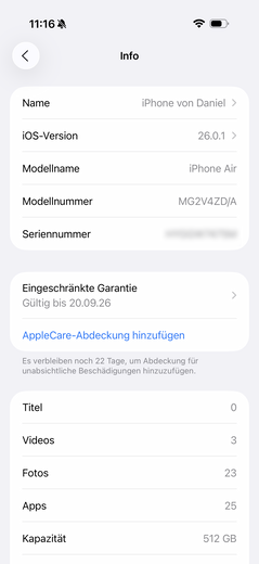 Apesar de sua bateria muito pequena, o iPhone Air continua funcionando por um tempo surpreendentemente longo, o que deve ser suficiente para um dia inteiro de uso moderado. Se esse não for o caso, o senhor não deve se afastar muito da fonte de alimentação mais próxima.