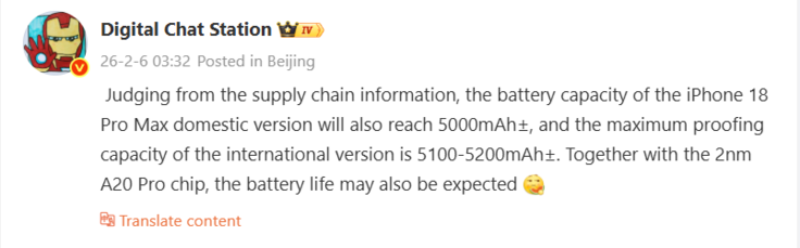 Com base em informações da cadeia de suprimentos, o vazador chinês Digital Chat Station acaba de revelar, pela primeira vez, detalhes bastante concretos sobre os tamanhos de bateria planejados que o Apple está planejando para o iPhone 18 Pro Max, previsto para o final deste ano. Assim, haverá novamente dois modelos diferentes do iPhone 18 Pro Max: um modelo somente eSIM com capacidade de bateria de cerca de 5.100 mAh a 5.200 mAh e um modelo clássico com slots nano-SIM que abrigará uma bateria de 5.000 mAh.