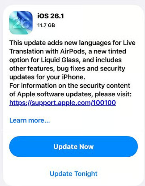 Após o lançamento do iOS 26 em setembro, juntamente com o lançamento do iPhone 17, a primeira grande atualização do atual sistema operacional do iPhone já está disponível. O patch de aproximadamente 4,6 GB introduz, entre outras coisas, a capacidade de reduzir a transparência e de tingir o "Liquid Glass" do Apple para melhorar a legibilidade do texto.