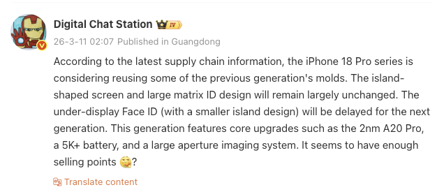 Rumores recentes sugeriram que Apple está mudando para um design de perfuração para o iPhone 18 Pro e Pro Max, localizado no canto superior esquerdo. Além disso, foi dito que um sensor infravermelho com Face ID ficará oculto ali, e o Dynamic Island não existirá mais. Outro rumor afirmava que haverá um sensor infravermelho invisível no canto superior esquerdo da tela juntamente com uma Dynamic Island menor. O Digital Chat Station aponta que isso agora foi adiado para a geração seguinte, ou seja, o iPhone 19 Pro.