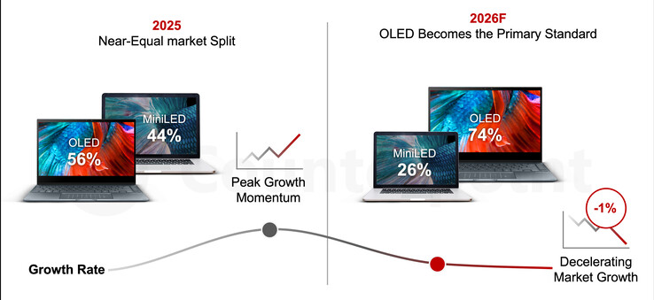 Embora a atividade do mercado como um todo pareça estar desacelerando, o segmento de telas premium verá uma grande mudança em breve, de acordo com o relatório. As remessas de notebooks OLED devem crescer 33% no próximo ano, ao contrário da tecnologia Mini LED, que deve sofrer uma queda de 43% nas remessas, já que as marcas estão abandonando o antigo sistema de luz de fundo em favor de painéis autoemissivos.