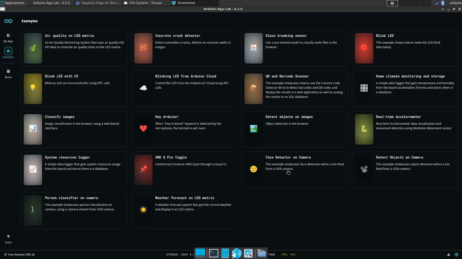 Também vale a pena mencionar os exemplos do Arduino App Lab. Eles apresentam aos usuários o fluxo de trabalho baseado em blocos do https://docs.arduino.cc/software/app-lab/tutorials/bricks/ e permitem fácil personalização. Muitos exemplos demonstram como os resultados do reconhecimento de imagens podem ser exibidos por meio da interface da Web de um smartphone. O UNO Q também pode funcionar como uma placa de desenvolvimento tradicional por meio do Arduino IDE 2.0+, caso em que apenas a MCU é programada, e não a APU da Qualcomm. Um caso de uso mais prático para a MCU sozinha pode ser um sistema de irrigação usando sensores de umidade e bombas. Os modelos pré-treinados também podem ser úteis para tarefas como análise de imagens ou reconhecimento básico de fala. De modo geral, os exemplos incluídos devem ser vistos como orientação e inspiração para a implementação de seus próprios projetos.