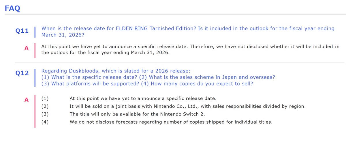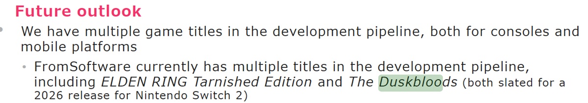 A Kadokawa incluiu uma atualização em seu relatório Q3 Fiscal Year 2026. Ao discutir o declínio dos lucros operacionais em comparação com o ano anterior, ela fez referência aos Jogos Switch 2. The Duskbloods e Elden Ring Tarnished Edition estão "ambos programados para lançamento em 2026"