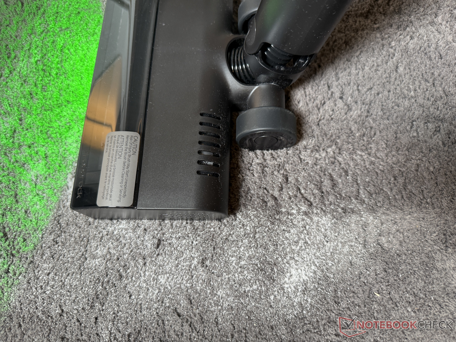 Segurar o aparelho é facilitado pelo fato de que nenhum botão precisa ser pressionado permanentemente com o dedo para que o aspirador de pó sem fio aspire. Em vez disso, ele é ligado por meio de um botão na parte superior da tela. Um segundo botão é usado para alternar entre os três níveis de potência. No entanto, durante o uso, é difícil alcançar esses botões com a mão (mesmo com uma mão grande), portanto, é necessário usar a segunda mão. Infelizmente, não há ajuste automático da potência de sucção (por exemplo, para carpetes).