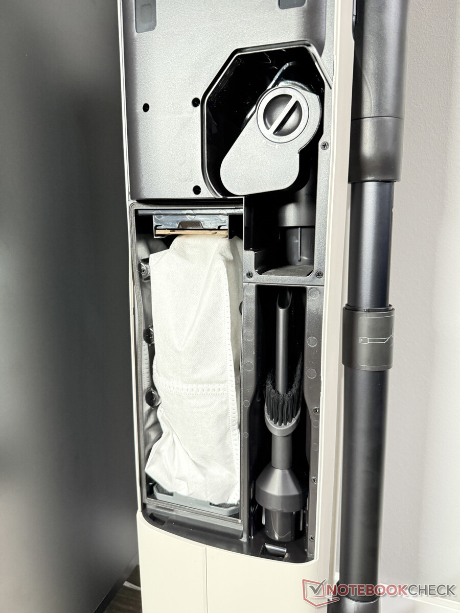 Para acessar a bolsa, é necessário remover um painel magnético no lado esquerdo da estação. Infelizmente, ele não se abre como uma porta, mas o senhor o tem em mãos. Além do saco para pó, também há espaço para dois dos acessórios fornecidos: a miniescova motorizada e a escova para fendas 2 em 1. Isso significa que os acessórios estão sempre no lugar.
