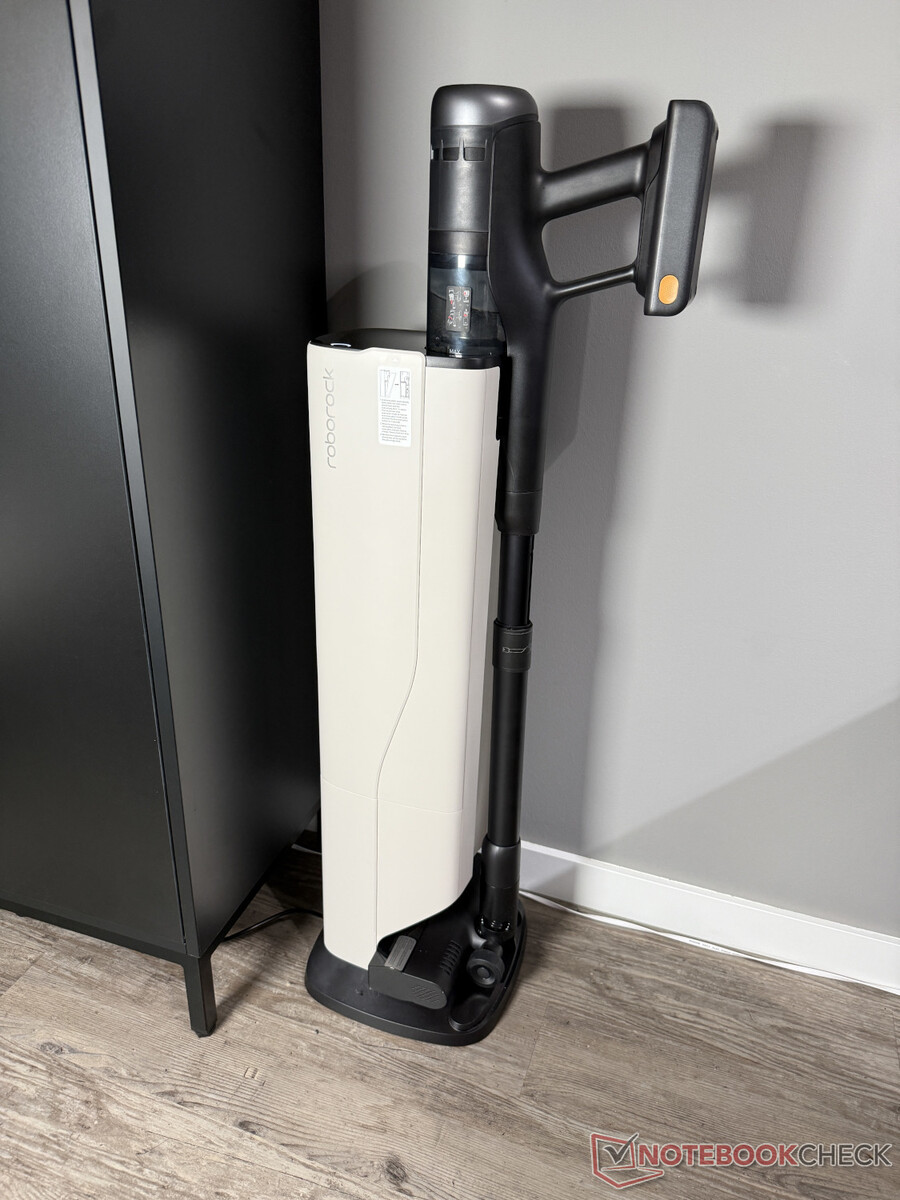 O aspirador pode ser colocado relativamente plano no chão, o que ajuda na limpeza embaixo dos móveis. Infelizmente, o tubo dobrável do Roborock H60 Ultra (sem uma estação) não está incluído na versão Hub. Com os outros dois bicos, que podem ser facilmente trocados, sofás, camas e similares, bem como juntas e fendas, também podem ser limpos com facilidade.