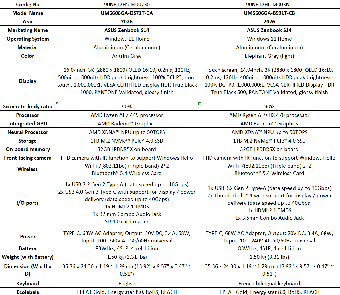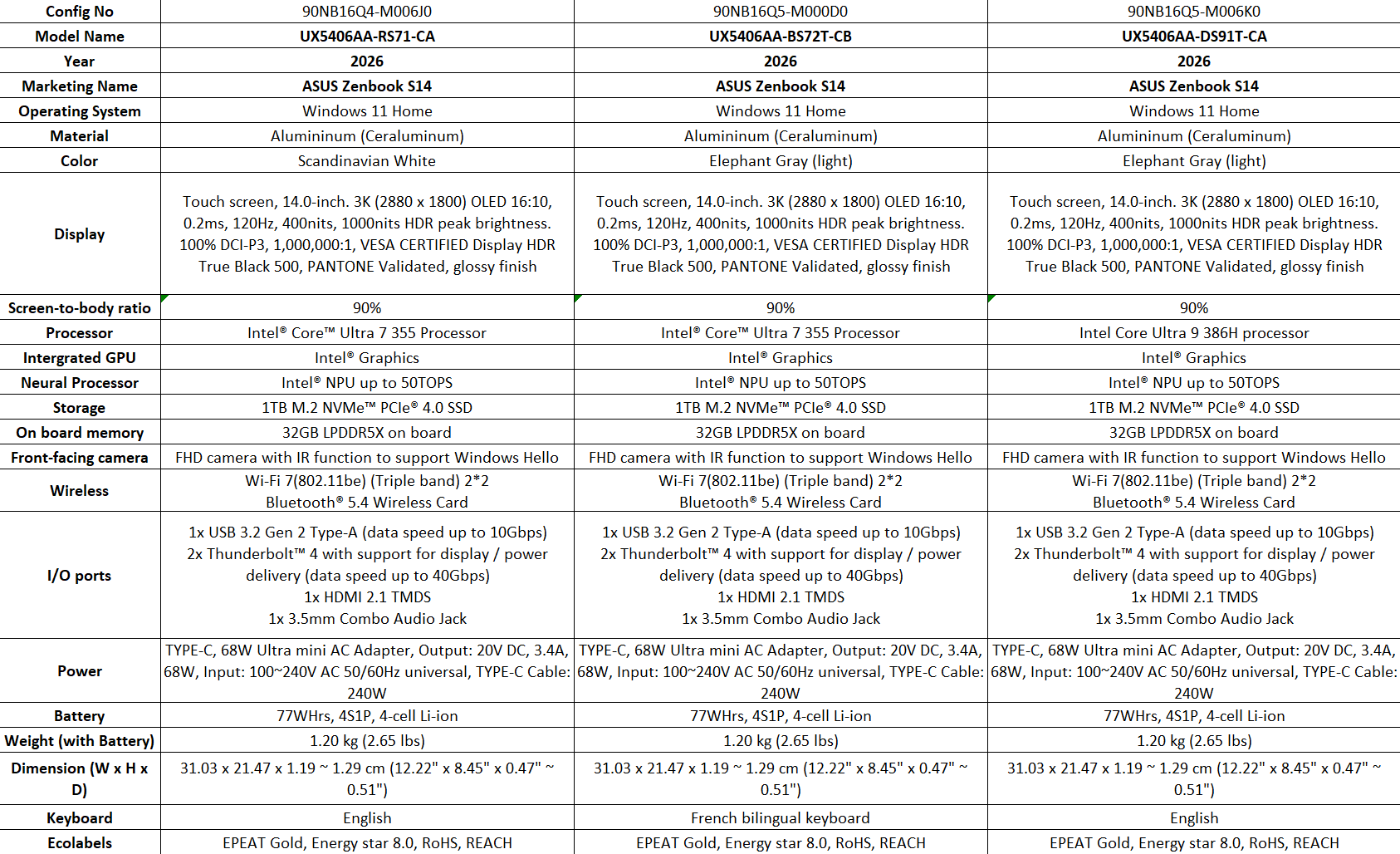 De acordo com os materiais de imprensa da Asus, a versão americana do Zenbook S14 oferece Core Ultra X7 e Core Ultra X9 enquanto os SKUs canadenses estão limitados ao Core Ultra 9 386H e o Core Ultra 7 355. Espera-se que as unidades vendidas na Europa também recebam as CPUs Core Ultra X Series 3, que apresentam Arc B390 integrados.
