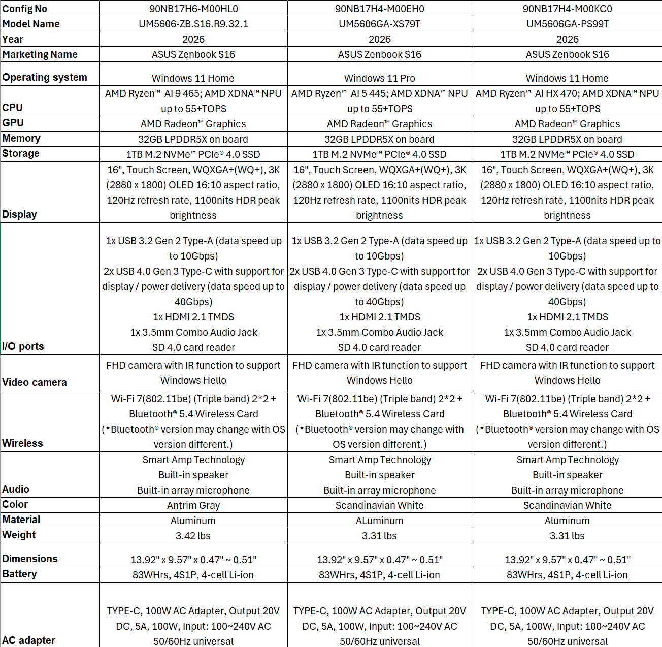 O Zenbook S16 (UM5606), por outro lado, apresenta o novo AMD Ryzen AI 400 Gorgon Point APUs. As configurações oferecidas para o mercado dos EUA incluem aquelas baseadas no Ryzen AI 9 HX 470, Ryzen AI 9 465e um estranho Ryzen AI 5 445 (provavelmente um erro de digitação) que ainda não faz parte da lista da AMD.